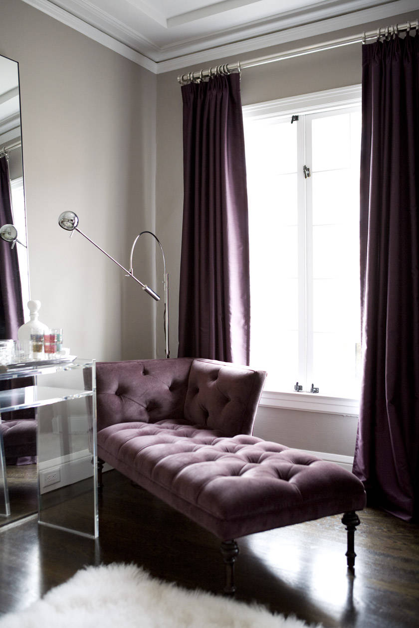 Wie bei vielen Polstermöbeln, werden auch bei solchen aus Samt die Sitz- oder Liegefläche häufig mit Knöpfen geheftet. Man nennt das Kapitonierung. Diese Technik macht das Material stabiler, mutet aber in Kombination mit den gedrechselten Beinen auch ein wenig altertümlich an. Deswegen hat man der verwaschen bordeauxfarbenen Chaiselongue und den Vorhängen einfach Möbel aus Chrom und Acryl entgegengesetzt.