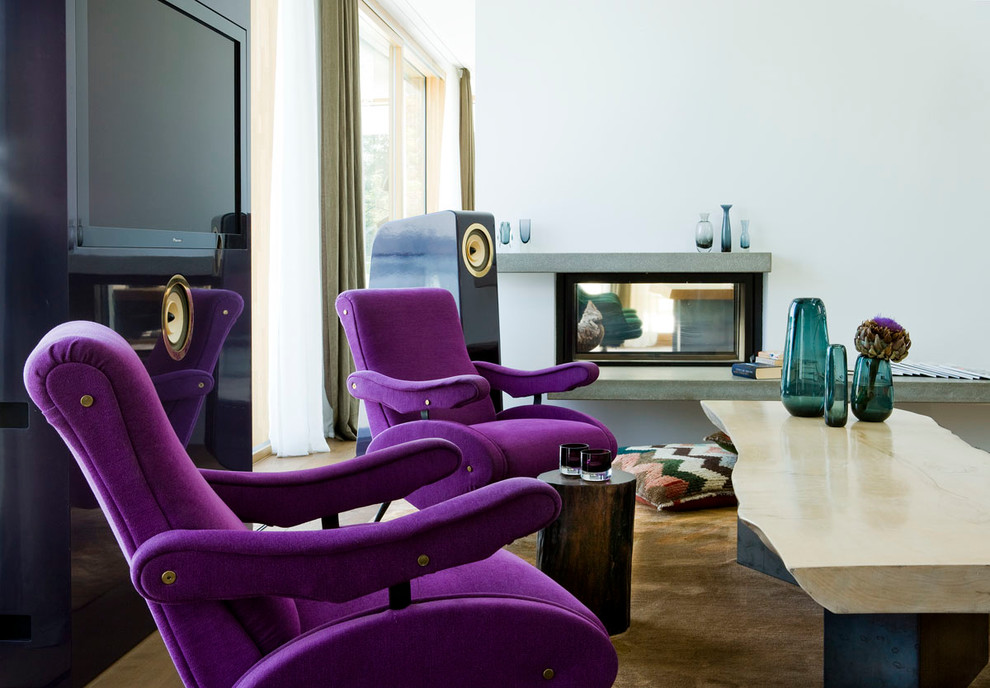 Farbkräftige Samtmöbel eignen sich hervorragend, um optische Highlights zu setzen. Die violetten Sessel fangen zwischen den Schwarz- und Cremetönen geradezu an zu leuchten. An solch intensiven Farbtupfern will man sich gar nicht satt sehen.
