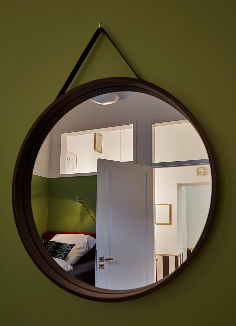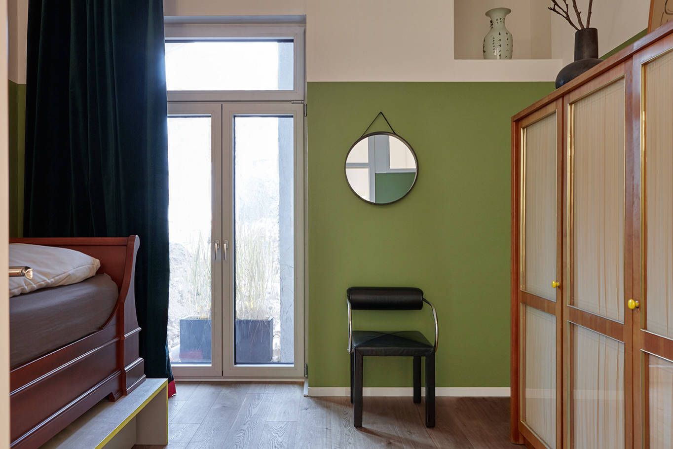 Das Schlafzimmer ist neben dem Bad der einzige Raum, der ohne die schwarzweiße Vertäfelung auskommt. Hier hat Maslankowski die Wände in einem satten Grünton streichen lassen. Der Anstrich endet mit der Unterkante der Oberlichter. „Das Schlafzimmer dieser Wohnung ist der ‚grüne Salon‘. Die Wände haben einen ruhigen Abendton, und der Blick geht nach draußen, ins Grüne“, erläutert die Architektin.