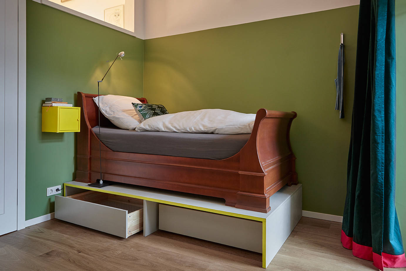 „Das Bett habe ich lange gesucht. Früher waren die Betten meist nur 1,90 Meter lang. Ich wollte aber ein zwei Meter langes haben“, erinnert sich die Architektin. „Als es dann im Raum stand, wirkte es etwas verloren. Da habe ich mich an die Skulpturen im Neuen Museum in Berlin erinnert, die alle auf einem Sockel stehen.“ So ließ sie einen Bettkasten auf Maß fertigen, dessen Kanten gelb leuchten. „Das Bett wird dadurch aufgewertet, und es liegt sich einfach angenehmer in diesem hohen Raum“, so Maslankowski.
