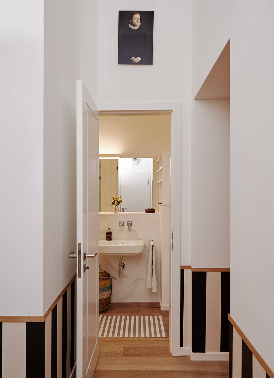 Die Wohnung liegt im Erdgeschoss eines Altbaus in Düsseldorf-Flingern, der eine umfassende Sanierung hinter sich hat. Dabei wurden Stahlbetondecken eingezogen, eine Fußbodenheizung wurde verlegt und die gesamte Haustechnik erneuert. Die Zimmerhöhe blieb erhalten. „Die meisten Räume in dieser Wohnung sind höher als breit“, berichtet Susanna Maslankowski. Um dennoch ein angenehmes Raumgefühl zu schaffen, hat sie eine halbhohe Wandvertäfelung – eine sogenannte Lambris – anbringen lassen, die sich fast durch die ganze Wohnung zieht. Durch ihr markantes schwarzweißes Muster verbindet sie die Räume miteinander.