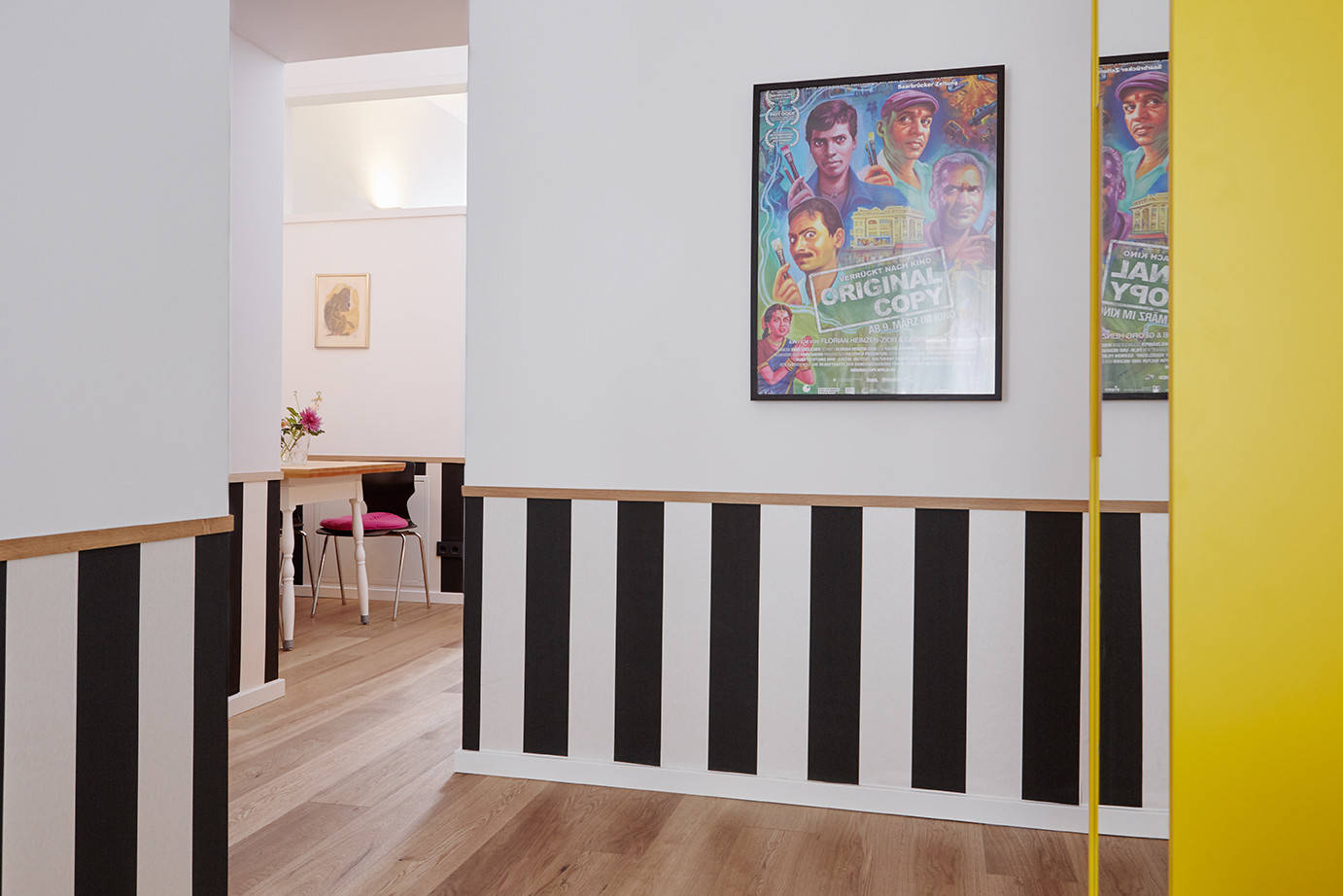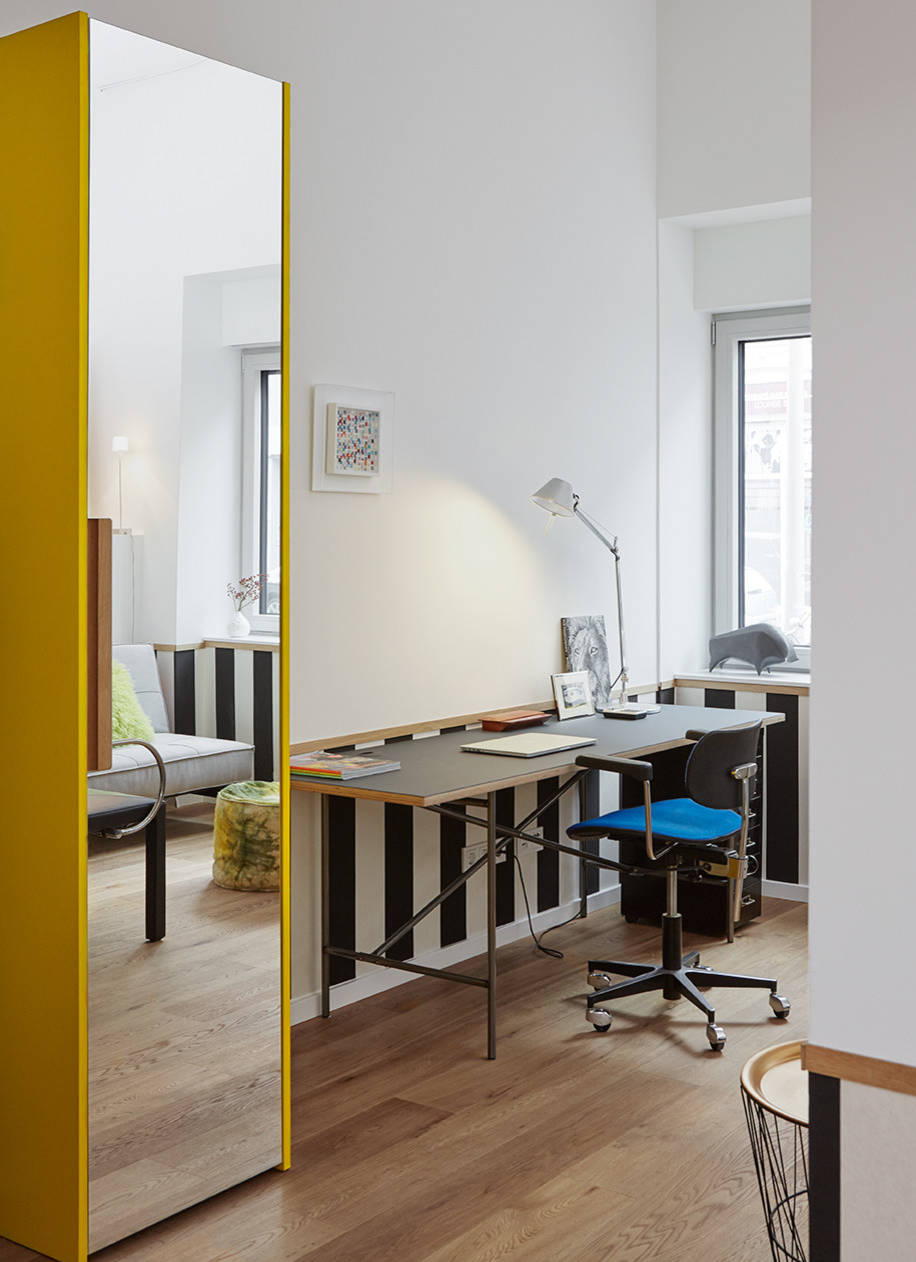 Einen Flur gibt es in dieser Wohnung nicht. Der erste Raum nach der Eingangstür ist das Wohn- und Arbeitszimmer. Ein schmaler, gelber Schrank mit einer Spiegeltür dient als Garderobe. „Es war nicht einfach, diesen Schrank zu finden. Ein normal hoher Garderobenschrank wirkt in den hohen Räumen nicht“, erzählt die Architektin. Der satte Gelbton taucht in jedem Raum auf – neben weiteren kräftigen Farben.