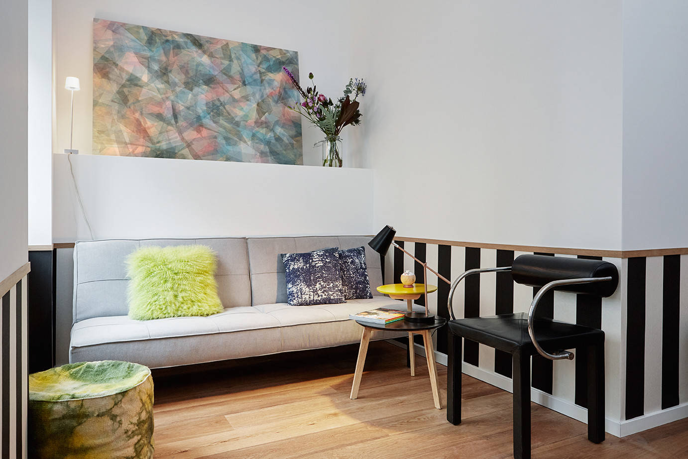 Die Nische für das Sofa ist durch den Einbau des Badezimmers entstanden. Es liegt direkt gegenüber der Eingangstür. Bis hier hinein zieht sich der geölte, gehobelte Eichenboden, der in der gesamten Wohnung neu verlegt wurde.