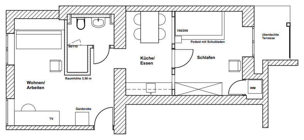 Im Grundriss ist die flurlose Zimmerfolge gut zu erkennen. Der Wohn- und Arbeitsbereich liegt zur Straße hin. Das Bad ist direkt gegenüber der Eingangstür. Der Küchen- und Essbereich grenzt als Zwischenzone direkt an das Schlafzimmer an.