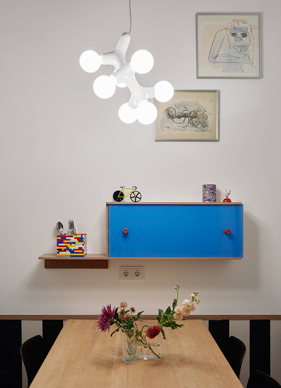 Gegenüber der Küchenzeile liegt der Essplatz. Hier hat Maslankowski Farbe ins Spiel gebracht. Das blaue Hängeschränkchen wurde von einem Tischler angefertigt, wie die Architektin betont. Der massive Buchenholztisch hingegen ist ein älteres Modell. Um ihm einem modernen Auftritt zu geben, wurden seine Beine weiß gestrichen.