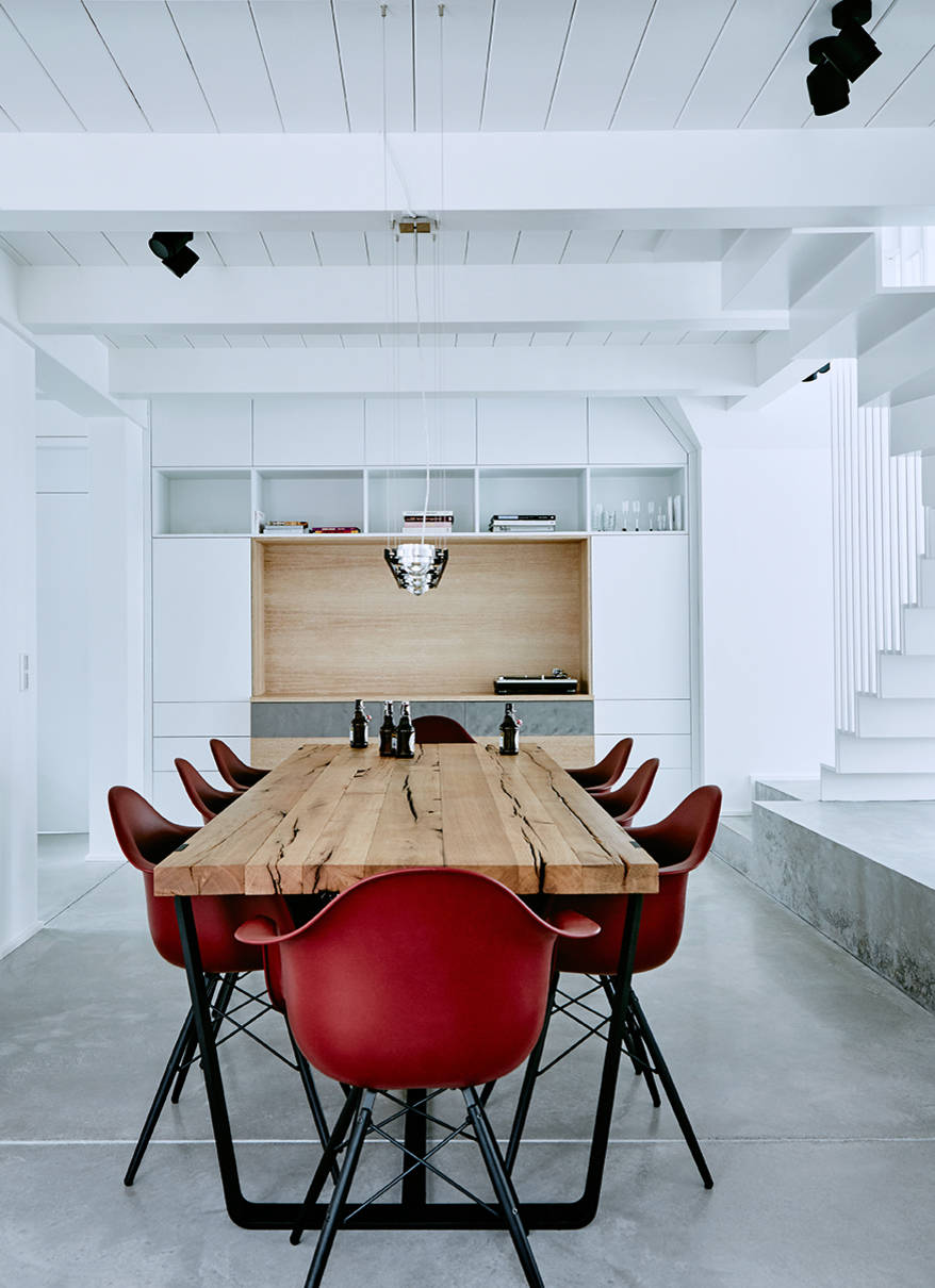 Der Esstisch „Clamp“ von Janua besteht aus 200 Jahre alten Eichenbalken und roughem Schwarzstahl und wird ergänzt durch „Eames Plastic Armchairs“ von Vitra in Oxidrot. Die Leuchte über dem Esstisch („Sento“ von Occhio) setzt einen coolen Kontrast zu den warmen Tönen der Essgruppe.