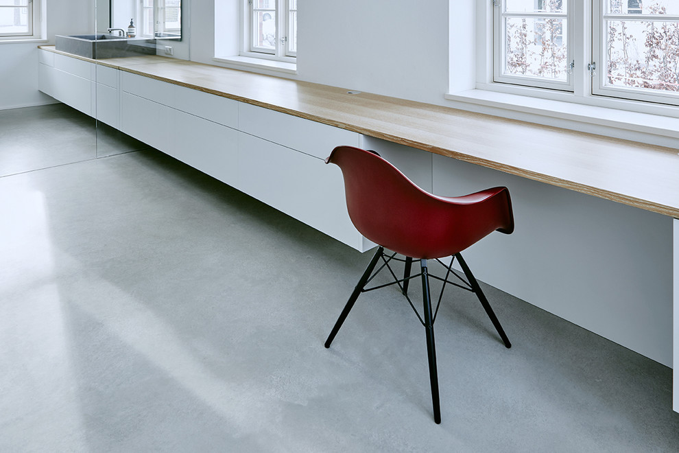 Der Schreibtisch wird nahtlos zum Waschtisch des En-Suite-Bades. „Auch das ist wieder ein Beispiel für eine gelungene Schreinerarbeit“, sagt Grotheer. Das Aufsatzwaschbecken ist aus Mineralwerkstoff und ein cooler Kontrast zur weiß gekalkten Eiche.