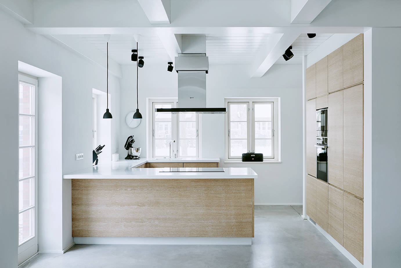 Die maßgefertigte Küche liegt gleich rechts des Eingangsbereichs; gefertigt wurde sie aus gekalkter Eiche. „Schreinerarbeiten spielen bei diesem Objekt eine tragende Rolle, denn gerade bei schlichten Möbeln ist die Ausführungsqualität sehr wichtig“, sagt Grotheer. Alle Maßanfertigungen hat der ortsansässige Schreiner Tobias Stahl übernommen.