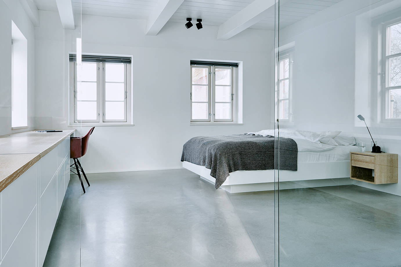 Die Gestaltung des Schlafzimmers, des ganzen Hauses, mag manch einem allzu puristisch sein – für die Eigentümer ist sie genau richtig. „Keine Deko! Darauf haben wir bewusst verzichtet. Gute Materialien und eine schlichte Eleganz waren den Eigentümern wichtiger als Schnickschnack“, so Grotheer.