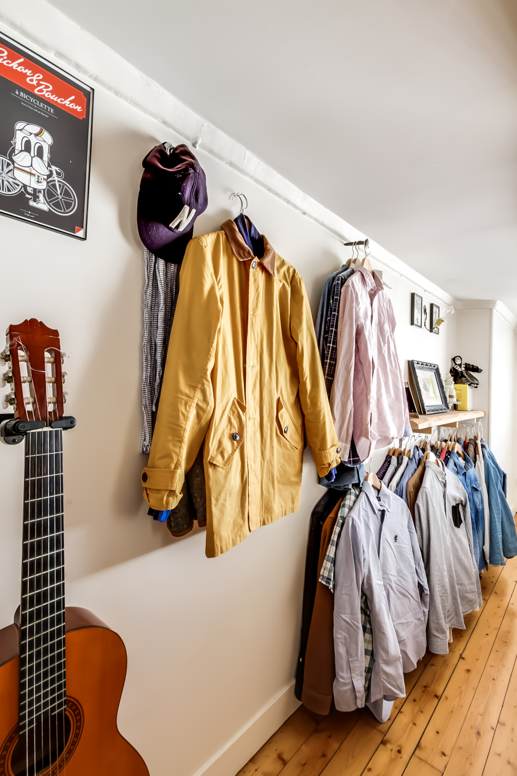Beim „Kleiderschrank“ entschied sich das Paar für die offene Variante. „Aus Platzgründen haben wir einfach alles direkt an die Wand gehängt.“