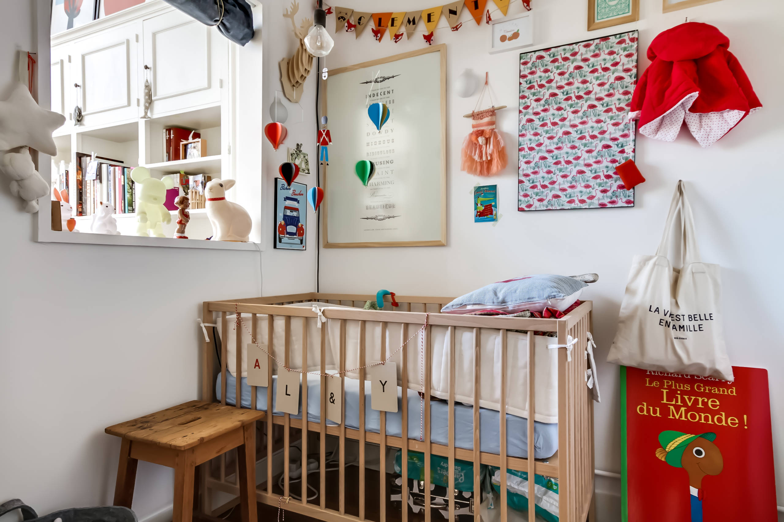 Damit auch Töchterchen Clémentine einen eigenen Bereich hat, haben Anne-Laure und Yannis auf ihren Arbeitsbereich verzichtet, den sie sich zunächst in dieser Ecke eingerichtet hatten. „Obwohl die Wohnung ziemlich klein ist, ist es uns gelungen, getrennte Schlafbereich zu schaffen. Ein Vorhang aus sehr dickem Stoff grenzt Clémentines Bereich vom Rest der Wohnung ab. So hat sie es in ihrem schlichten und gleichzeitig praktischen Kinderzimmer schön gemütlich.“