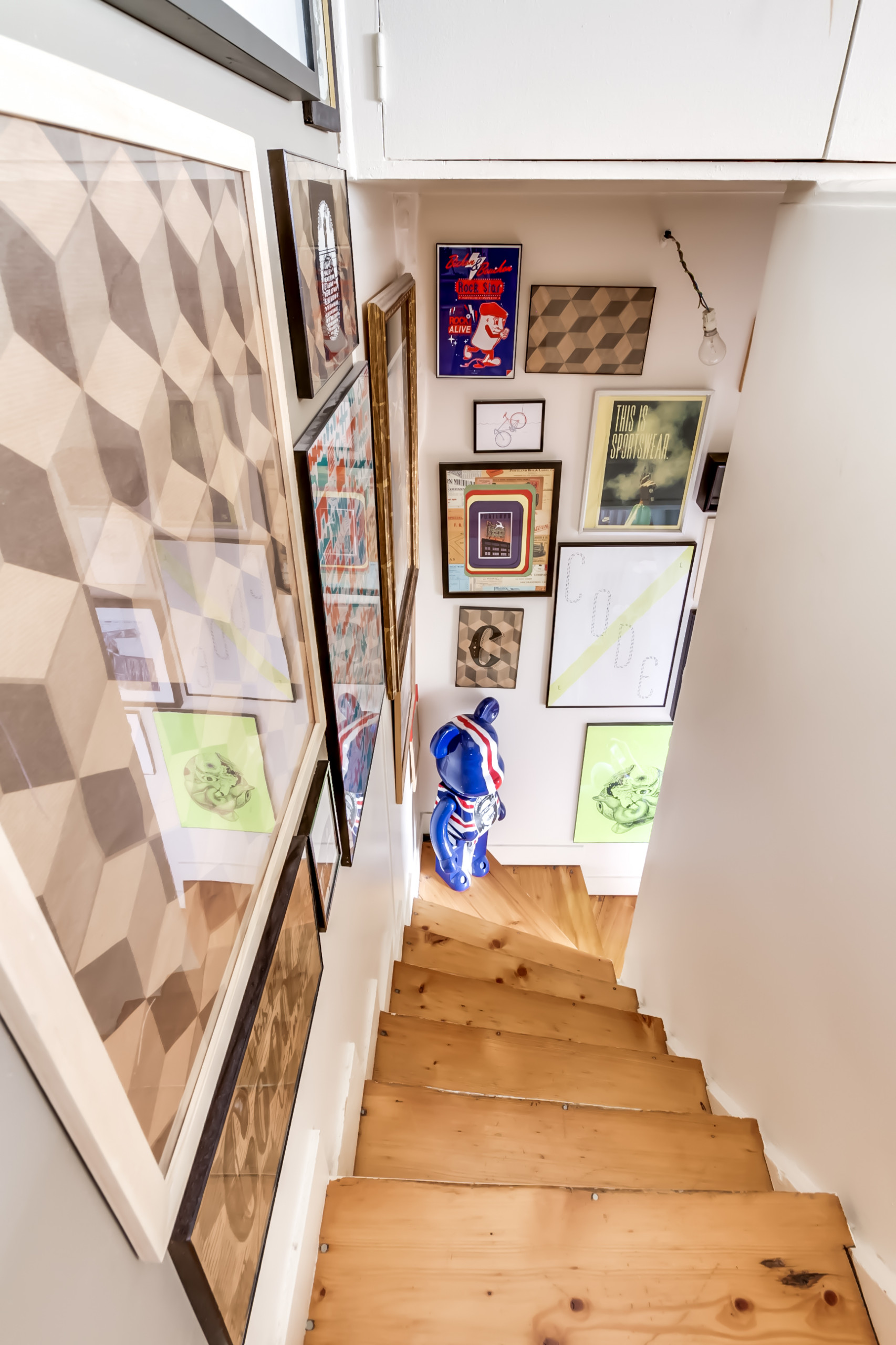 In dem kleinen Treppenhaus, über das man in den oberen Schlafbereich gelangt, haben Anne-Laure und Yannis einige ihrer Bilder mit Kunstwerken anderer Künstler kombiniert – eine einzigartige und unkonventionelle Mischung.