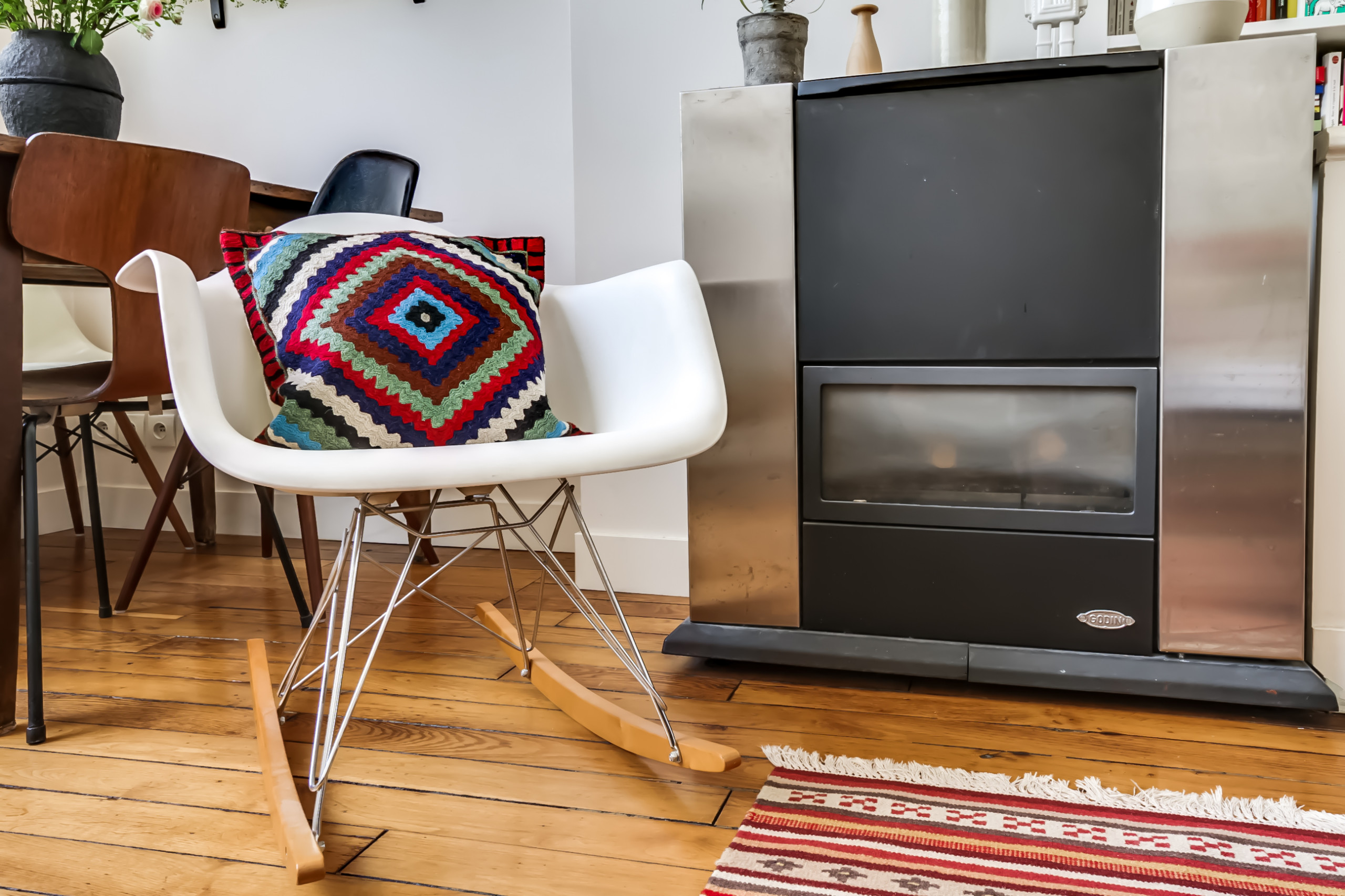 Den weißen „Eames Plastic Armchair RAR“ von Vitra hat Yannis direkt vor dem Holzofen platziert – der perfekte Ort zum Lesen oder für entspannte Momente mit dem Baby. „Den Schaukelstuhl haben mir meine Freunde zum 29. Geburtstag geschenkt – mein erster Design-Klassiker! Den wollte ich schon immer haben“, erzählt Yannis. Er hat sich hauptsächlich um die Einrichtung ihres neuen Zuhauses gekümmert: „Mein Interesse für Inneneinrichtung entwickelte sich während meines Studiums der angewandten Kunst. Besonders spannend finde ich den Menschen hinter jedem Objekt und die Geschichte, die es erzählt“, erklärt er.