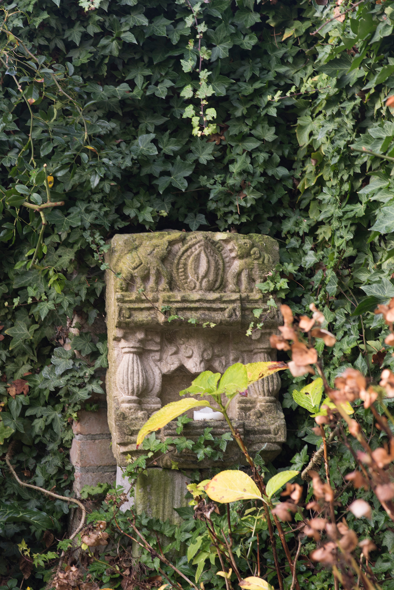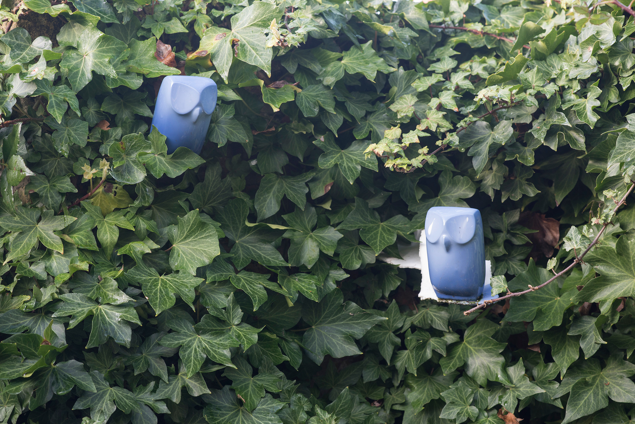 Inmitten des üppigen Grüns haben es sich zwei Porzellan-Eulen von Pieter Stockmans gemütlich gemacht. „Die Eulen waren ein Geschenk von einem Freund“, erzählt Gustaaf.