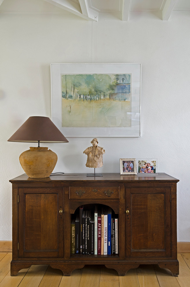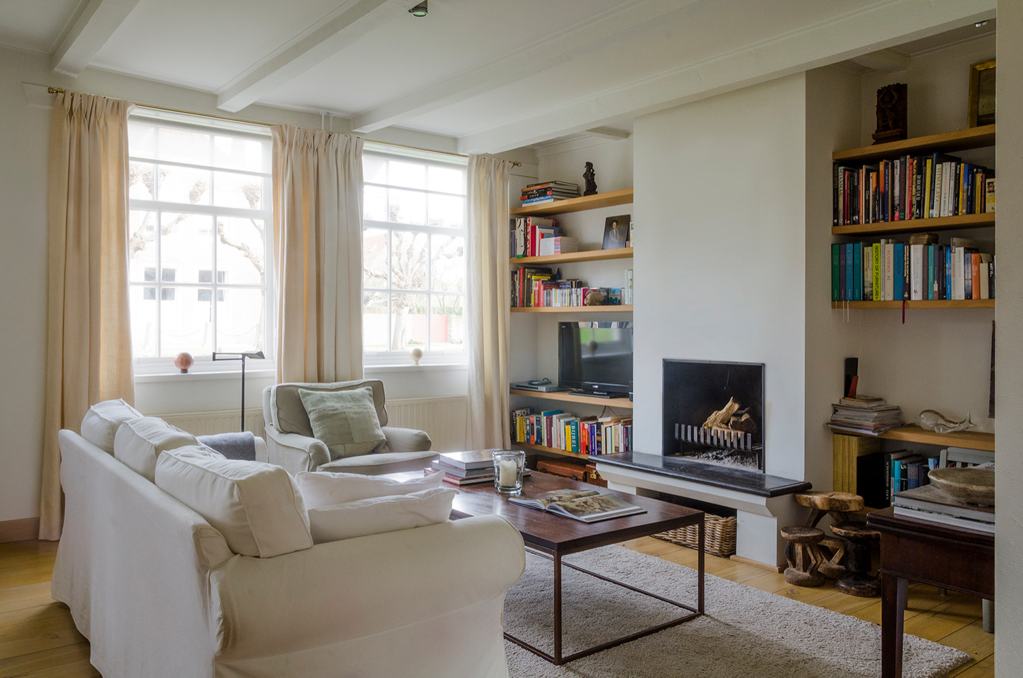 „Da wir das Haus nur als Feriendomizil nutzen, haben wir bei der Einrichtung schon etwas aufs Geld geachtet. Die meisten Möbel besaßen wir bereits. Wir haben sie einfach mit Stücken von Ikea kombiniert“, so Gustaaf. „Außerdem haben wir das Haus mit jeder Menge Reisesouvenirs und Werken von Künstlern aus der Region gefüllt“, fügt Gertrude hinzu. Gemeinsam hat das Paar schon die halbe Welt bereist: von Papua-Neuguinea, über den Virunga Nationalpark im Kongo bis nach Nepal, Myanmar und Äthiopien hat es sie bereits verschlagen. Die kleinen Holzhocker neben dem Kamin stammen zum Beispiel aus Botswana und Südafrika.
