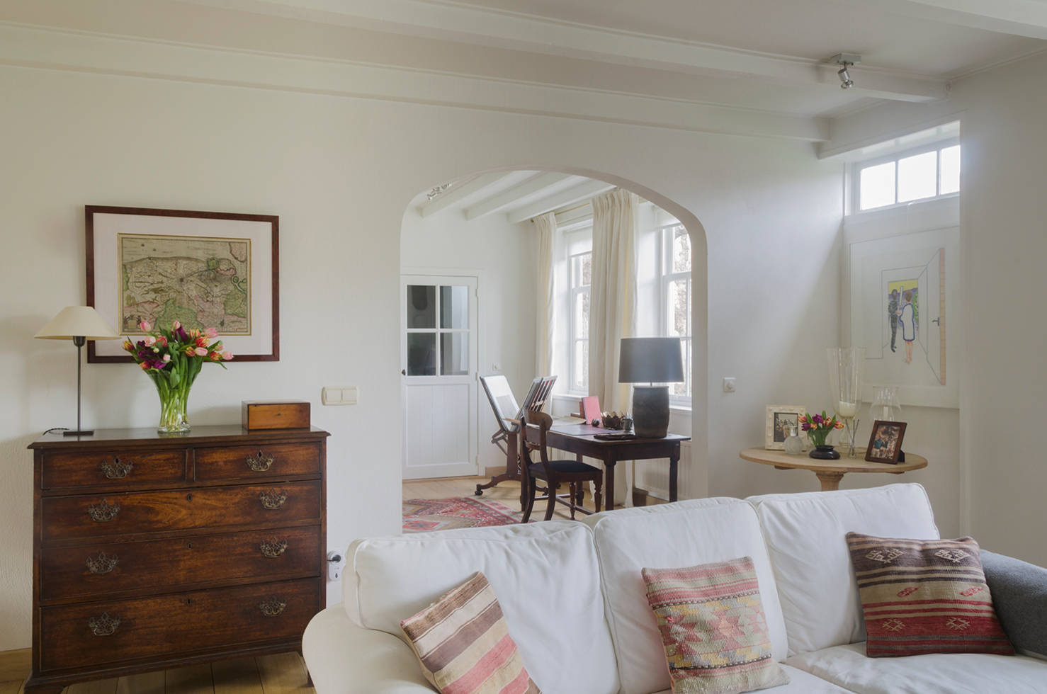 Über der englischen Kommode hängt eine antike Landkarte der flämischen Küstenregion. Die kleine Box aus Zedernholz haben die reiselustigen Niederländer aus Marokko mitgebracht.