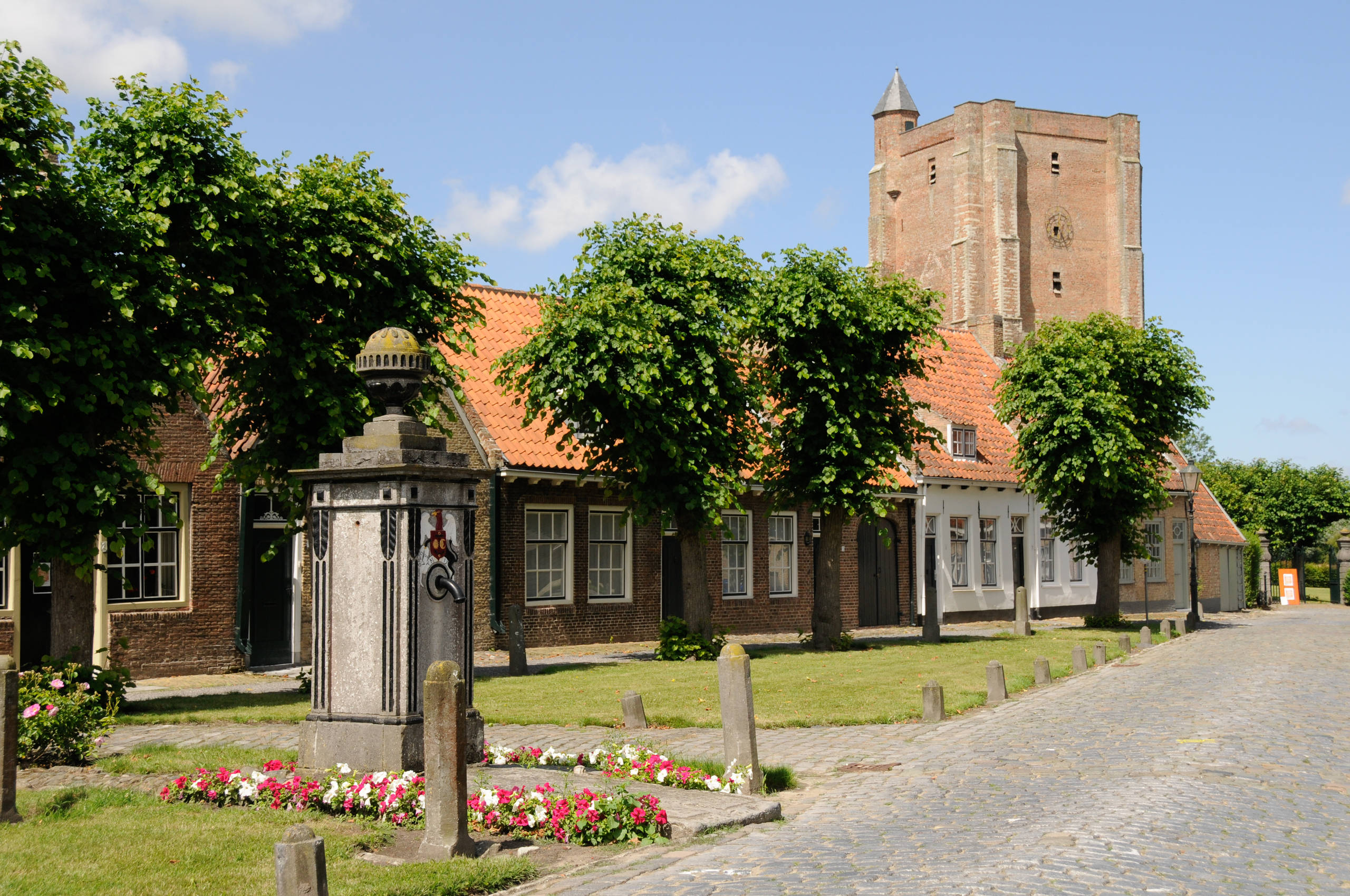 Von der Straße aus kann man im Hintergrund den Turm der Sint-Anna-Kathedrale sehen, der einzigen noch erhaltenen gotischen Kathedrale, die der Stadt einst ihren Namen gab. Die Geschichte der Stadt geht zurück bis ins Mittelalter. Im Laufe der Jahre wurde sie immer wieder zerstört und neu aufgebaut. Sint Anna besitzt einen Nebenhafen zu dem von Brügge, weshalb der Stadt seit jeher eine wichtige wirtschaftliche Bedeutung zufiel. Die Reihenhäuser auf dem Foto stammen etwa von 1900.