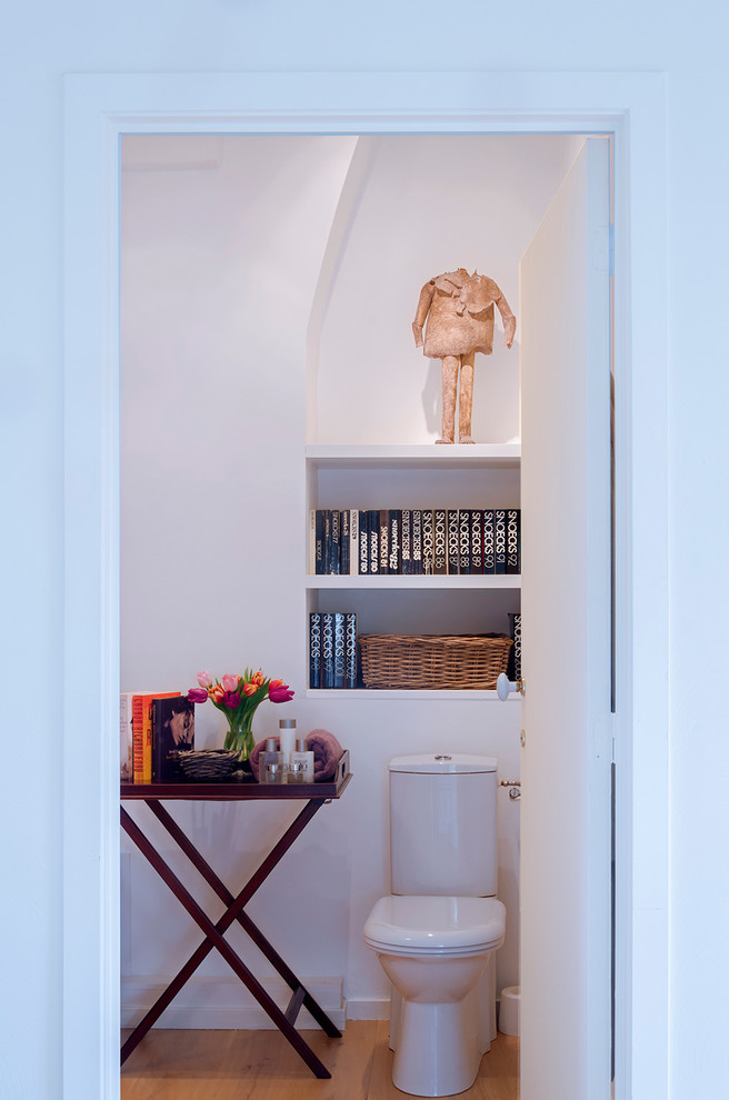 Im Badezimmer schaffen ein Beistelltisch aus Holz, Bücher und eine weitere von Gertrudes Skulpturen eine warme und gemütliche Atmosphäre.