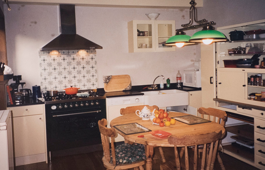 VORHER-NACHHER: In der Küche kombinierten die Eigentümer maßgefertigte Küchenschränke mit belgischen Stein- und marokkanischen Zellige-Fliesen als Spritzschutz über dem Herd „Die Grundaufteilung der Küche haben wir beibehalten, genau wie die alten Schrank-Korpusse, die wir lediglich mit neuen Fronten aufgewertet haben“, erklärt Gertrude. „Für einen einheitlicheren Look haben wir die Küchenzeile noch etwas nach rechts erweitert.“ Die Kücheninsel ließ das Paar maßanfertigen.