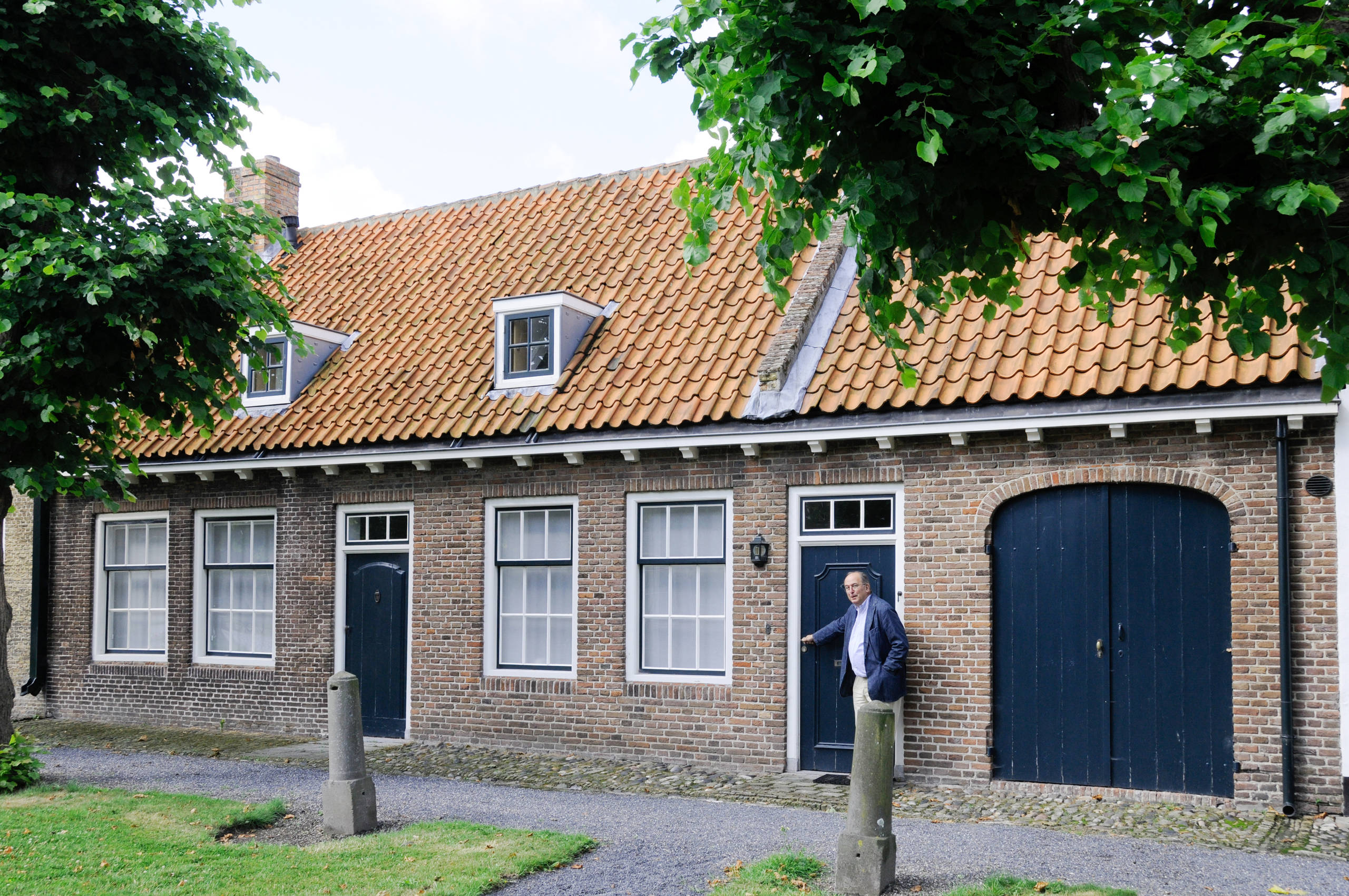 Das Feriendomizil der Huybrechs besteht im Grunde aus zwei Einzelhäusern – bescheidene Gebäude, in denen früher Fischer- und Schmiedefamilien wohnten. Die vorherigen Eigentümer hatten die beiden Gebäude zu einem einzigen großen Wohnhaus zusammengelegt und aufwändig saniert. Hier sehen wir Gustaaf vor der Eingangstür. Es gibt noch zwei weitere Türen nach drinnen – einen Hintereingang und das Scheunentor. Diese werden zwar heute nicht mehr benutzt, mussten aber erhalten bleiben, da das Gebäude und das gesamte Stadtgebiet unter Denkmalschutz stehen.