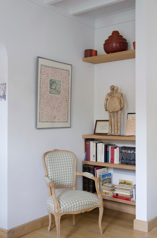 Der mit kariertem Leinenstoff bezogene Stuhl bringt einen rustikalen Touch in den Raum. Darüber hängt eine Lithographie des belgischen Künstlers Pierre Alechinsky. „Wir sind Mitglieder in einem Kunstverein, der lokale Künstler unterstützt. Über diesen Verein können wir immer wieder Kunstwerke in einer Art Mietkauf erwerben“, erzählt Gustaaf.