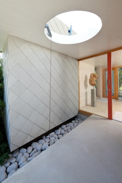 Im Zwischenraum zwischen der neun Meter langen Garage und dem Wohnraum, liegt der Eingangsbereich.