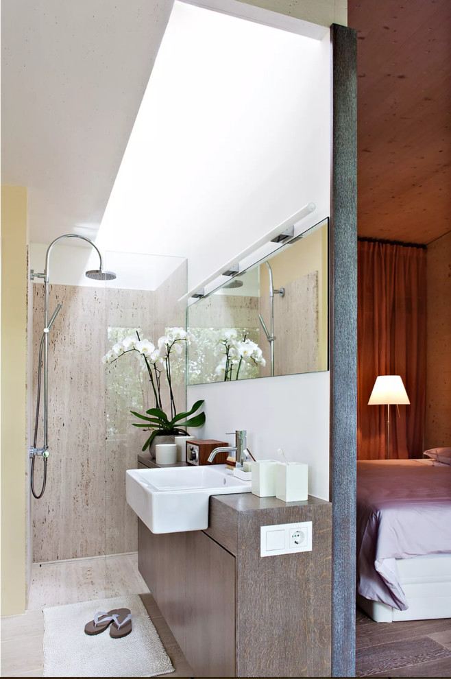 „Hineingestellt als Haus im Haus ist das Bad, wodurch Schlafen und Wohnen voneinander getrennt werden. Im Bad ist im Dach ein Shed mit zwei Velux Fenstern zur Belichtung und Belüftung eingebaut und wird von der Morgensonne golden gefärbt.