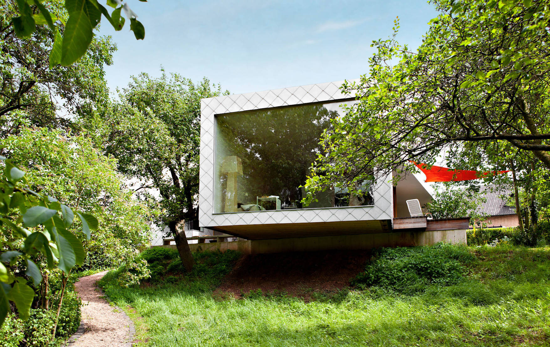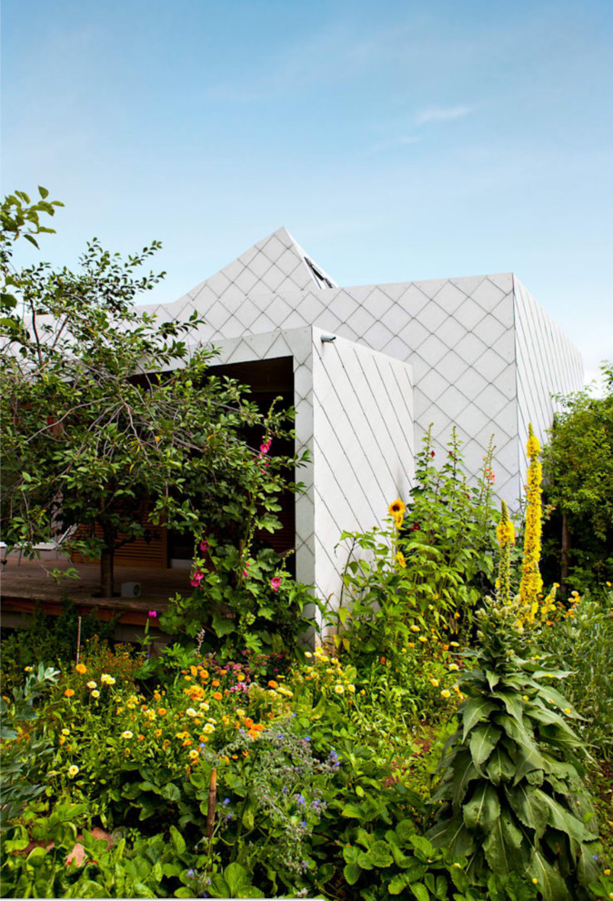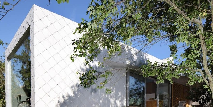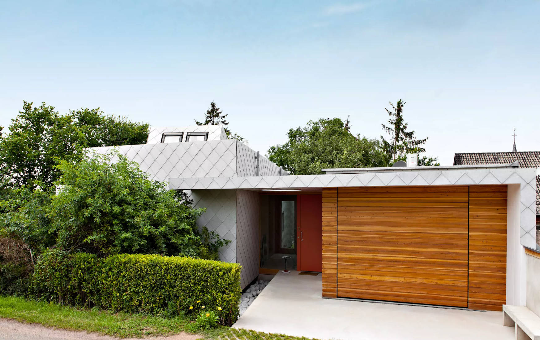 Bei den Platten selbst handelt es sich um hellgraue Eternit-Platten im Format 40x40 Zentimeter, welche die gesamte Fassade und die Gebäudeecken abdecken. Das ebenso traditionelle wie moderne Deckungsbild mit der Spitzschablone wirkt grafisch und ausdrucksstark. Außerdem garantiert der Werkstoff Faserzement einen hohen Witterungsschutz und ist sehr beständig.