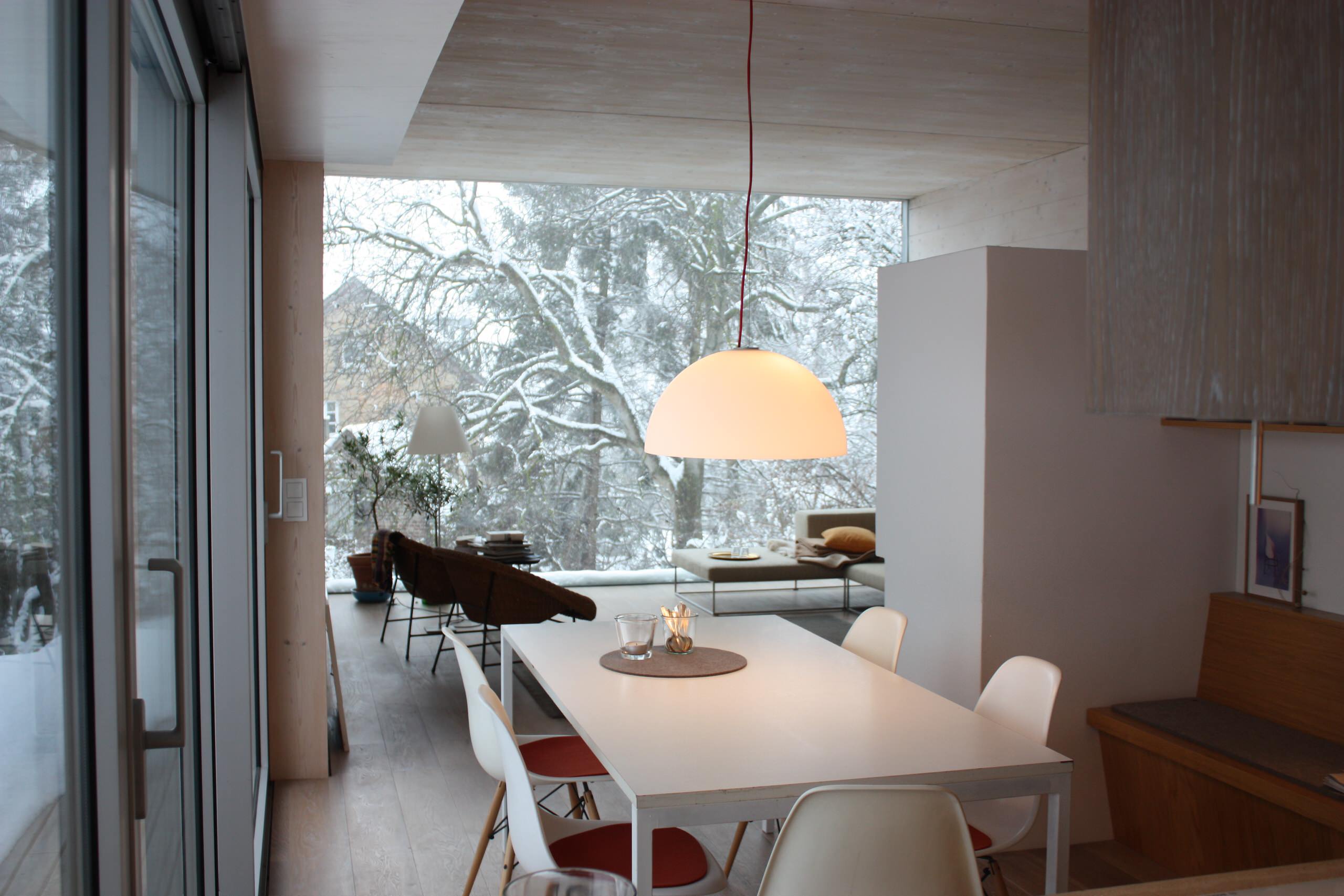 Belichtet wird die sogenannte Holzröhre über eine Scheibe von 4,60 Metern Breite und drei Metern Höhe. Nach einem äußerst inspirierenden Vortrag von Holzexperte Erwin Thoma zum Thema Holzbau, stand für Danke die Entscheidung fest, mit Thomas Unternehmen sein neues Holzhaus zu planen. 22 Tonnen massive Holzbauteile aus Weißtanne wurden mithilfe eines Tiefladers aus dem Schwarzwald angeliefert und auf dem 1700 Quadratmeter großen Grundstücks auf vorbereitete Fundamente montiert. Das Ganze hat rekordverdächtige zwei Tage gedauert.