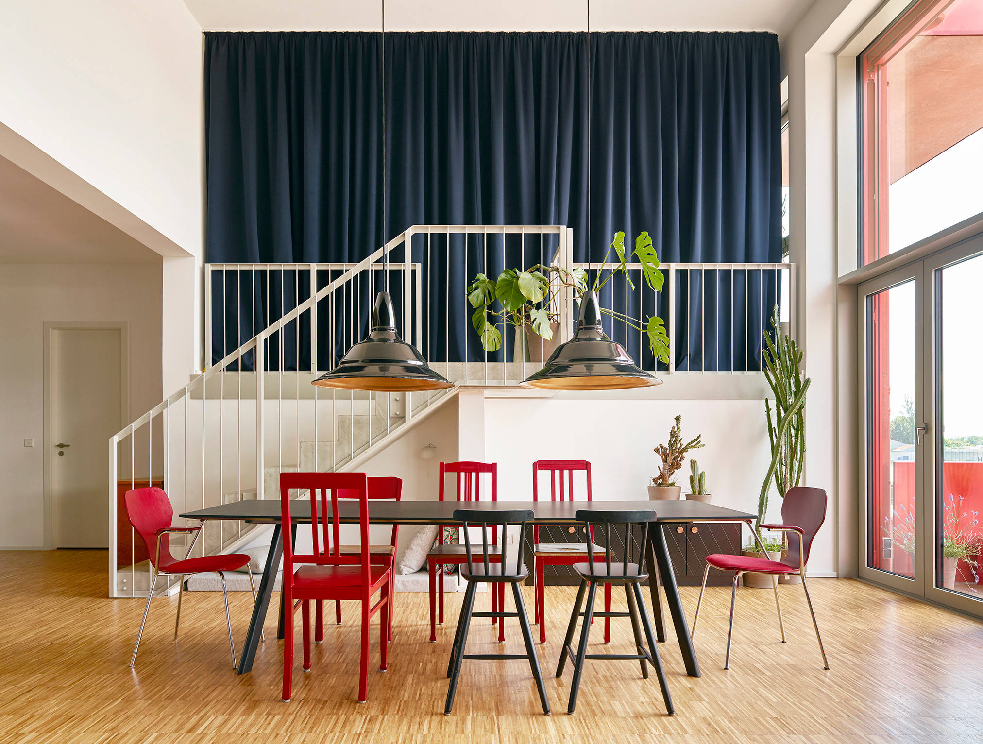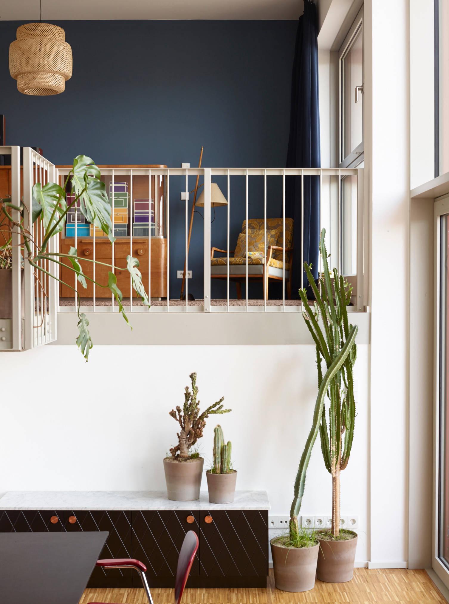 In Abgrenzung dazu ist die Empore auf einer der Längsseiten des Esstischs in Blau gehalten. „Der Raum war als Rückzugsort für die Eltern und als Gästezimmer gedacht“, sagt Schimmelbusch. Ein blauer Baumwollvorhang gibt dem Raum die nötige Privatsphäre. Mittlerweile ist er vor allem zum Musikzimmer geworden, in dem der Vater und die Töchter gemeinsam auf ihren Instrumenten spielen.