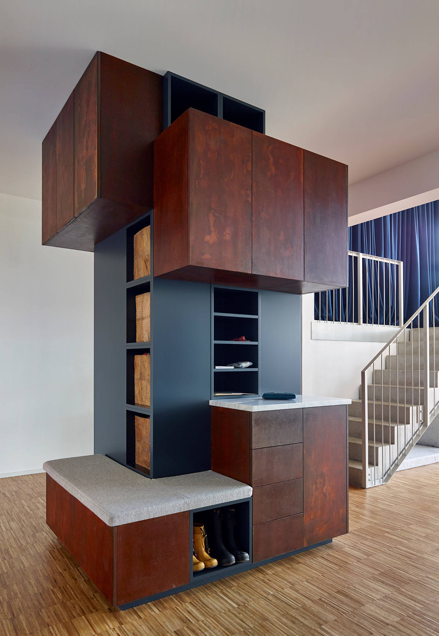 Ein deckenhoher Kubus fängt den Blick im großen Eingangsbereich. Er trennt das Entree vom Wohnraum, verdeckt die Türen zu Bad und Kinderzimmer und lenkt den Blick auch von der Glasfront des Elternschlafzimmers ab. Zudem bietet er vielfältigen Stauraum. Zur Eingangstür hin ist die Garderobe untergebracht. Eine bequeme Bank lädt zum Wechseln der Schuhe ein. Gleich um die Ecke steht für jedes Familienmitglied ein Fach mit persönlichen Dokumenten wie Ausweis oder Impfpass bereit. Zum Essplatz hin ist Geschirr verstaut. Und auf der Seite, die zum Kinderzimmer weist, ist der Kleiderschrank der Kinder untergebracht.