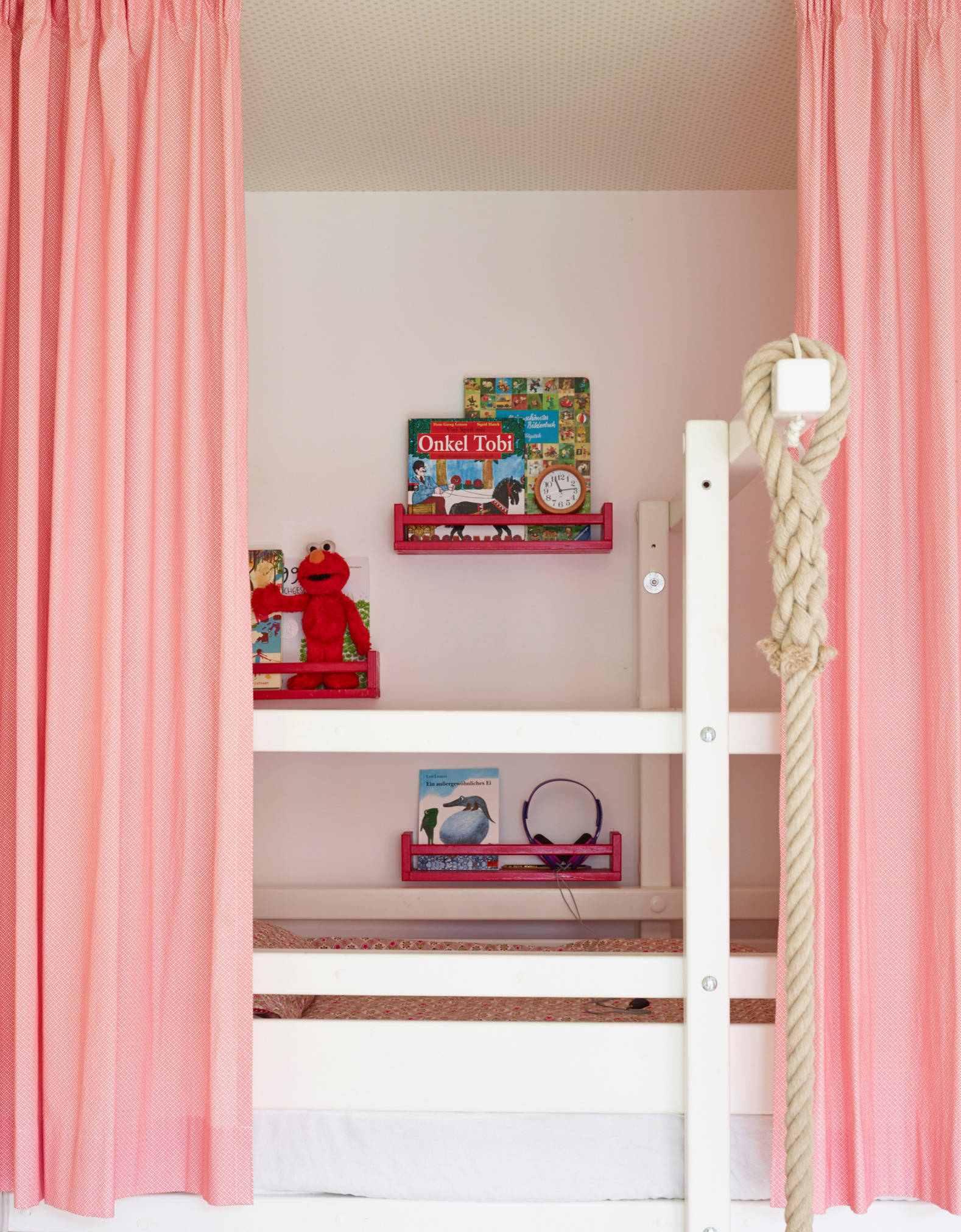Das Bett der Mädchen musste aus der alten Wohnung mit in die neue. Es ist ein Doppelstockbett, bei dem unter dem unteren Bett noch eine Matratze für Übernachtungsgäste verstaut werden kann. „Es war von Anfang an klar, dass dieses Bett wieder ins Kinderzimmer sollte. Es hat auch ein Seil, über das die Mädchen ins obere Bett klettern können“, so Antonius.