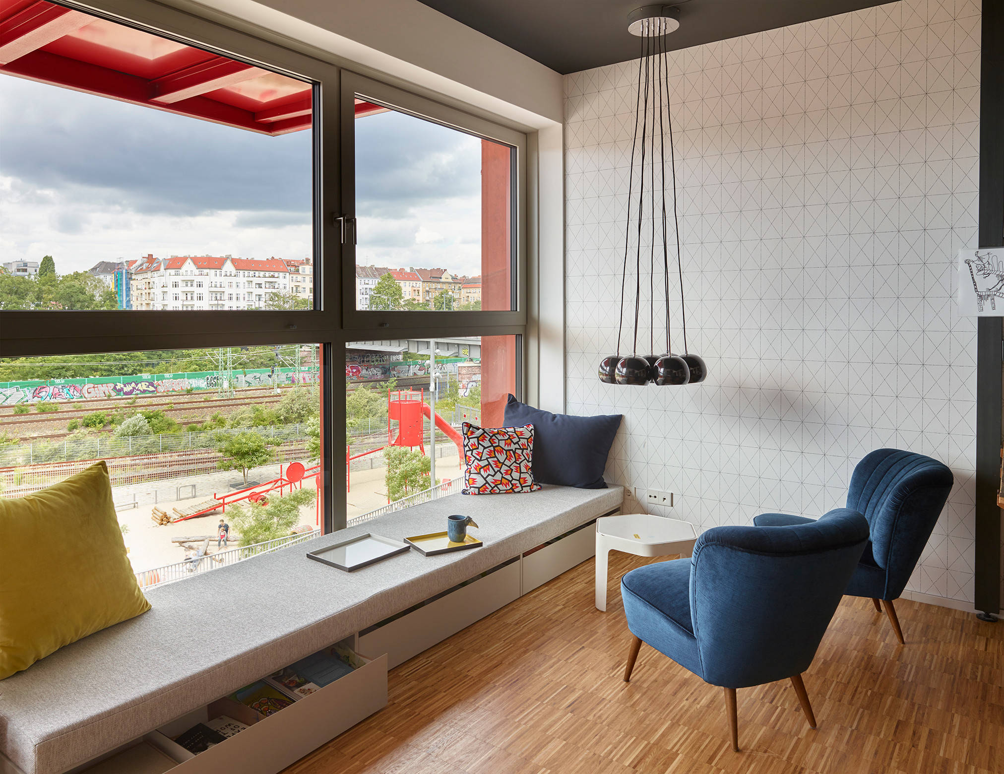 „Mit Rot haben wir die Farbe des Gebäudes, aber auch der nahen Bahnanlagen aufgenommen. Es ist das Rot der Deutschen Bahn in unterschiedlichen Abstufungen“, erläutert Antonius. Auch der Outdoorteppich in Fliesenoptik auf dem Balkon, die Blumenkästen und der Schaukelstuhl bringen den Farbton ins Spiel. Im Sommer wird der Balkon zum Wohnraum, der Übergang von Innen nach Außen wird durchlässig.