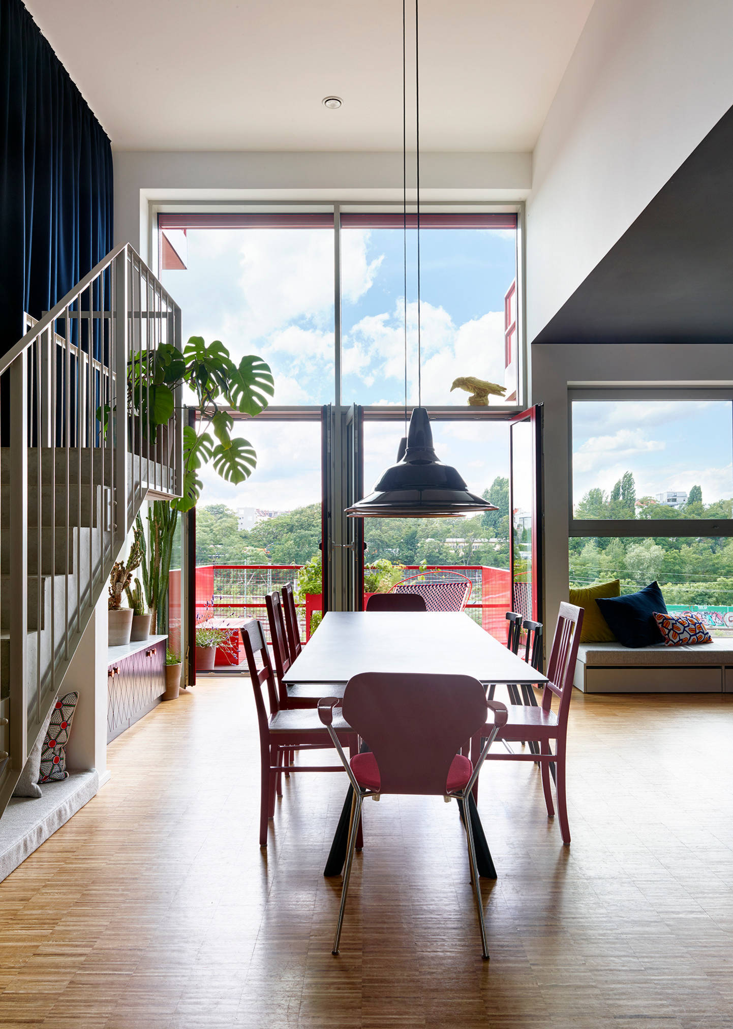 Die Wohnanlage am Lokdepot in Berlin-Schöneberg, die vor einigen Jahren fertiggestellt wurde, hat mit ihren signalroten Fassaden Farbe ins Stadtbild gebracht. In der Wohnung, die sich eine junge Familie hier gekauft hat, findet sich dieses Rot wieder – aber auch andere Farben geben den Räumen Charakter. Durch unterschiedliche Raumhöhen entsteht eine abwechslungsreiche Struktur. Der offene Grundriss spielt mit den Ebenen; abgeschlossene Zimmer gibt es nur wenige. Um hier eine gemütliche Atmosphäre zu schaffen und jedem Familienmitglied ausreichend Raum zu geben, beauftragte die Familie gleich nach dem Kauf die Expertinnen von Antonius Schimmelbusch Interior Design, ihr neues Heim zu gestalten.