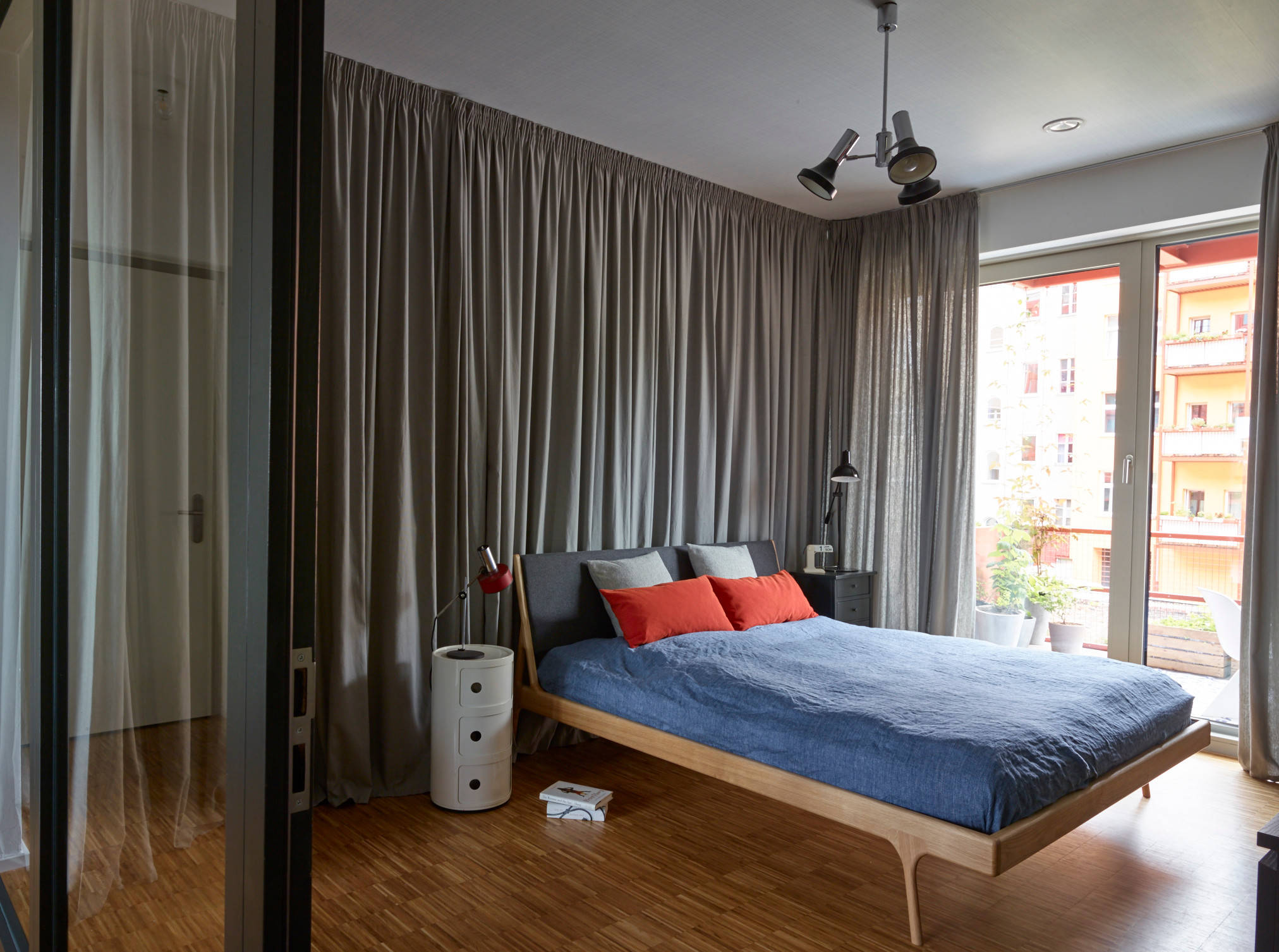 Das Elternschlafzimmer liegt gleich neben dem Eingang. Die hellen Buchenrahmen der gläsernen Trennwand wurden schwarz gestrichen. So sehen sie wie Industriefenster aus. Auch hier ist die Decke tapeziert, das Karomuster erinnert an die Fünfzigerjahre. Ein umlaufender grauer Vorhang bietet Sichtschutz an der zum Wohnraum hin verglasten Wand und auf der gegenüberliegenden Fensterseite mit dem zweiten Balkon der Wohnung. Der Vorhang läuft auch hinter dem Kopfende des Bettes entlang und trennt ihn auf diese Weise optisch von der Wand, die dahinter liegt und eine Tür zum begehbaren Kleiderschrank enthält. „Der Schlafraum ist wie ein kleines Schmuckkästchen“, findet Schimmelbusch. Die Nachttischleuchten und die Deckenleuchte stammen aus dem Fundus der Familie – wie alle Leuchten in der gesamten Wohnung. „Wir lieben es, bereits vorhandene Stücke auszusuchen und neu in Szene zu setzen. Ein wenig können wir uns da wie Kuratorinnen fühlen“, sagt Schimmelbusch.