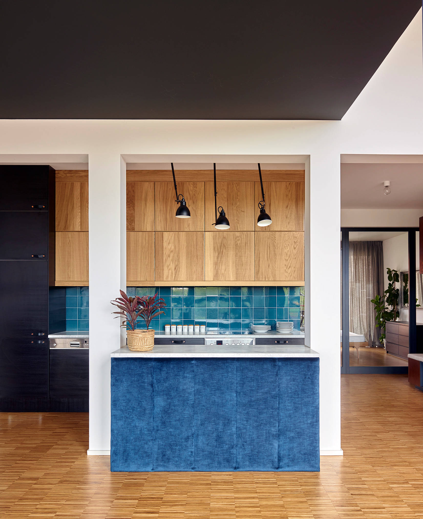 Auch bei der Gestaltung des Küchenbereichs standen die Alltagsaktivitäten der Bewohner im Mittelpunkt. Mit ihren zehn Hängeschränken ist die Küche nicht gerade klein. Die Vorderseite der Kücheninsel wurde mit blau meliertem Samt gepolstert. „Die Kinder und ihre Freunde lehnen sich hier gerne an, wenn sie auf dem Fußboden sitzen“, erzählt Antonius. Das Stäbchenparkett ist in der ganzen Wohnung verlegt. Die Kücheninsel hatten Antonius und Schimmelbusch vorgeschlagen, um dem offenen Grundriss mehr Struktur zu geben und den Küchenbereich deutlicher vom Wohnzimmerbereich abzugrenzen. Der rechte Pfeiler war bereits vorhanden, aus Gründen der Symmetrie haben sie den linken hinzugefügt und so die Kücheninsel eingerahmt. Die Arbeitsplatte ist aus weißem Marmor. Die blauen Fliesen von Golem geben der Ikea-Küche einen individuellen Touch.