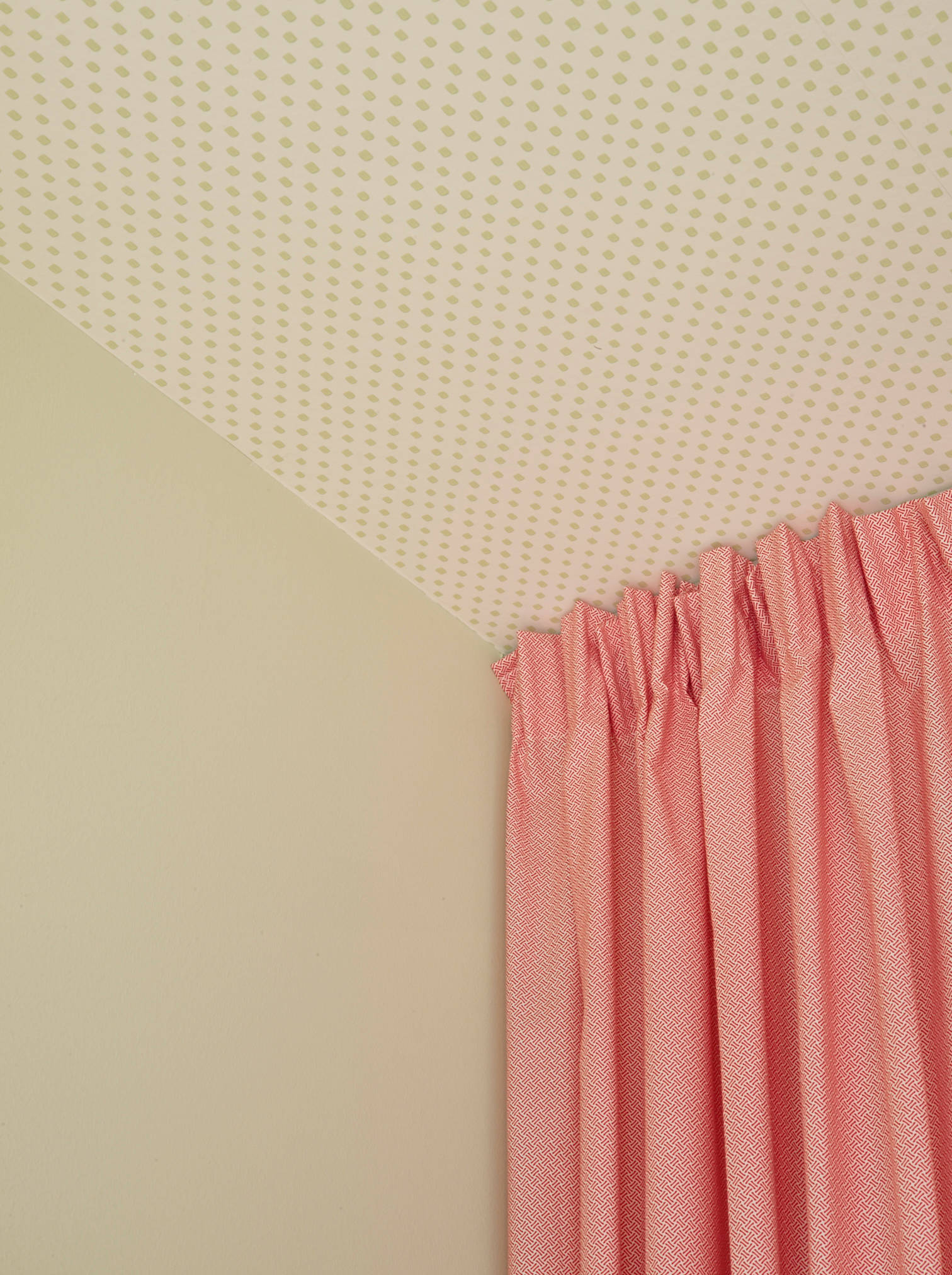 Die Decke ist mit einer Tapete bedeckt, deren Punktmuster die Farbe der Wand aufnimmt.