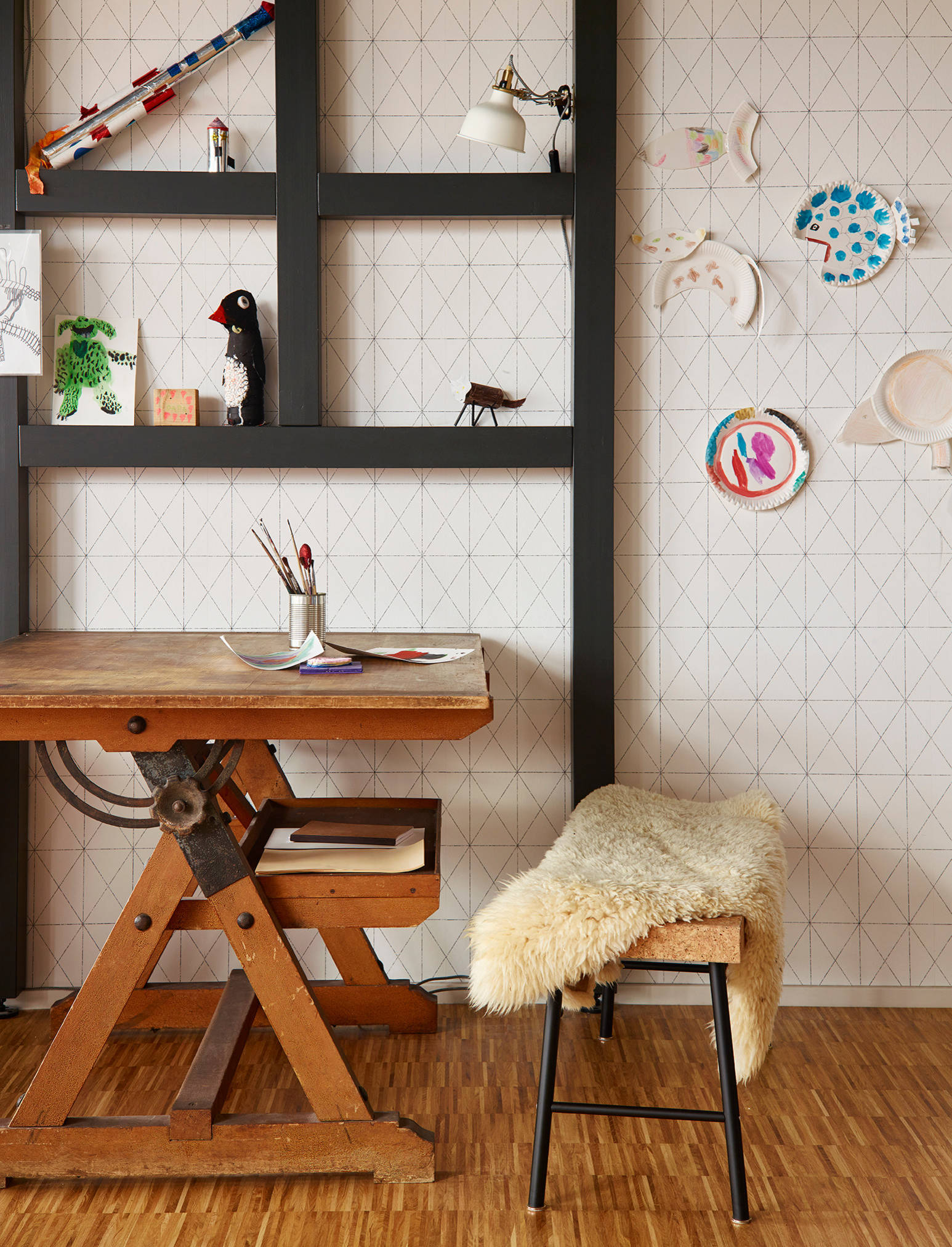 Die Bastelarbeiten entstehen vor allem an dem Schreibtisch, der zwischen Wohnzimmerbereich und Küche an der Wand steht. Aktuelle Arbeiten können auf einem etwa zehn Zentimeter tiefen, schwarz gestrichenen Wandregal ausgestellt werden, wie die beiden Interior Designerinnen erläutern. Die Wand dahinter ist mit einer grafisch gemusterten Tapete von Sandberg Wallpaper tapeziert.