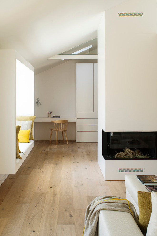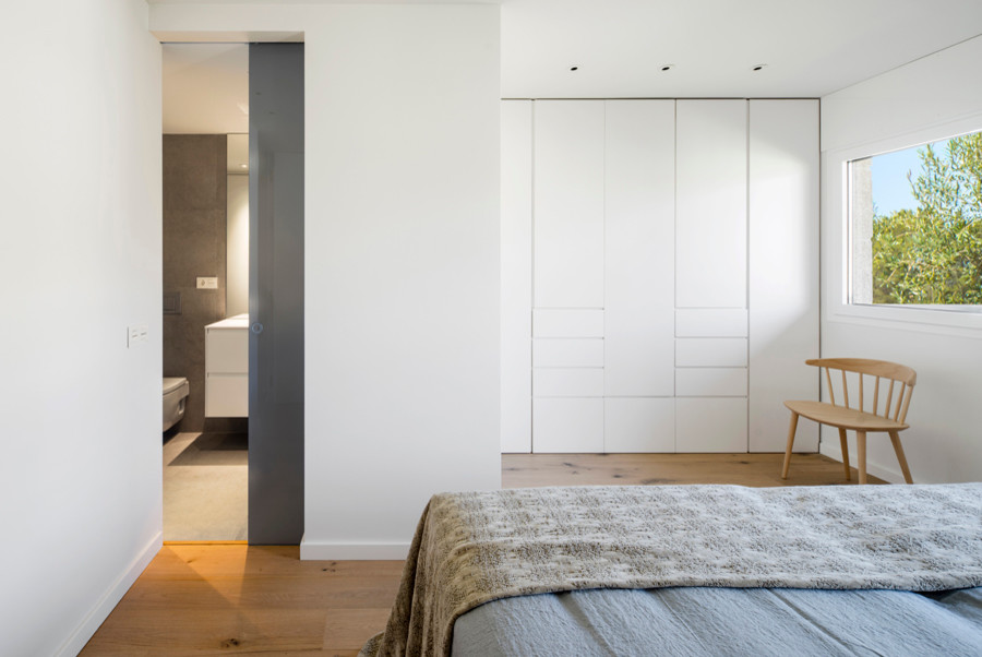 In diesem Schlafzimmer versteckt sich die Tür zum Badezimmer – das wie ein Quader ins Zimmer gestellt ist – zwischen maßgefertigten Einbauschränken. Komplettiert wird der Raum durch einen Arbeitsplatz, der ebenfalls von Susanna Cots entworfen wurde.