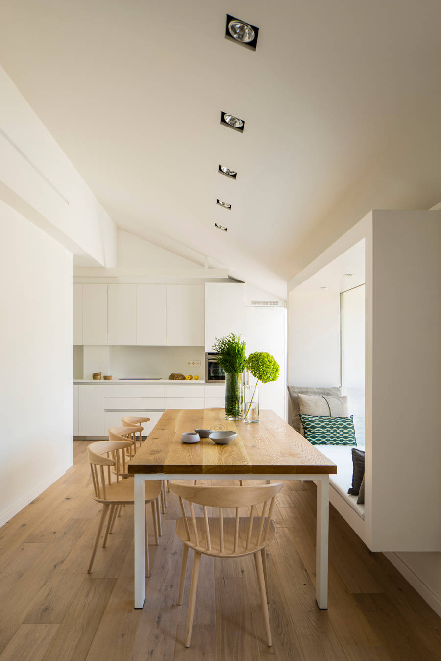 In dieser Maisonettewohnung lässt es sich entspannen, sei es nun einen Urlaub lang – oder jeden Tag. Und genau das war das Ziel. Interior-Designerin Susanna Cots wählte die Farben mit Bedacht, Weiß ist ohne Zweifel auf beiden Etagen der Protagonist, begleitet von zartem Grau und wenigen Farbakzenten. Dem großen Wohnraum der oberen Ebene schenkte Cots eine neue Offenheit, mit maßgefertigten Sitzfenstern zur Dachterrasse hin. Zusammen ergab das alles eine nordische Frische; und die Wohnung verwandelte sich in eine moderne Oase der Ruhe.
