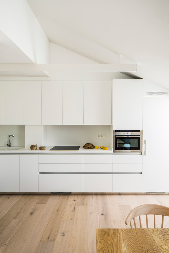 Doch zurück nach drinnen. In der einzeiligen Küche wiederholt sich das Einrichtungskonzept, klare Linien und viel Weiß. Die Firma Zania Design baute die Küche nach einem Entwurf von Susanna Cots. Ganz schlicht, ohne Griffe oder Deko-Elemente, sogar der Dunstabzug verschwindet hinter weißen Fronten.