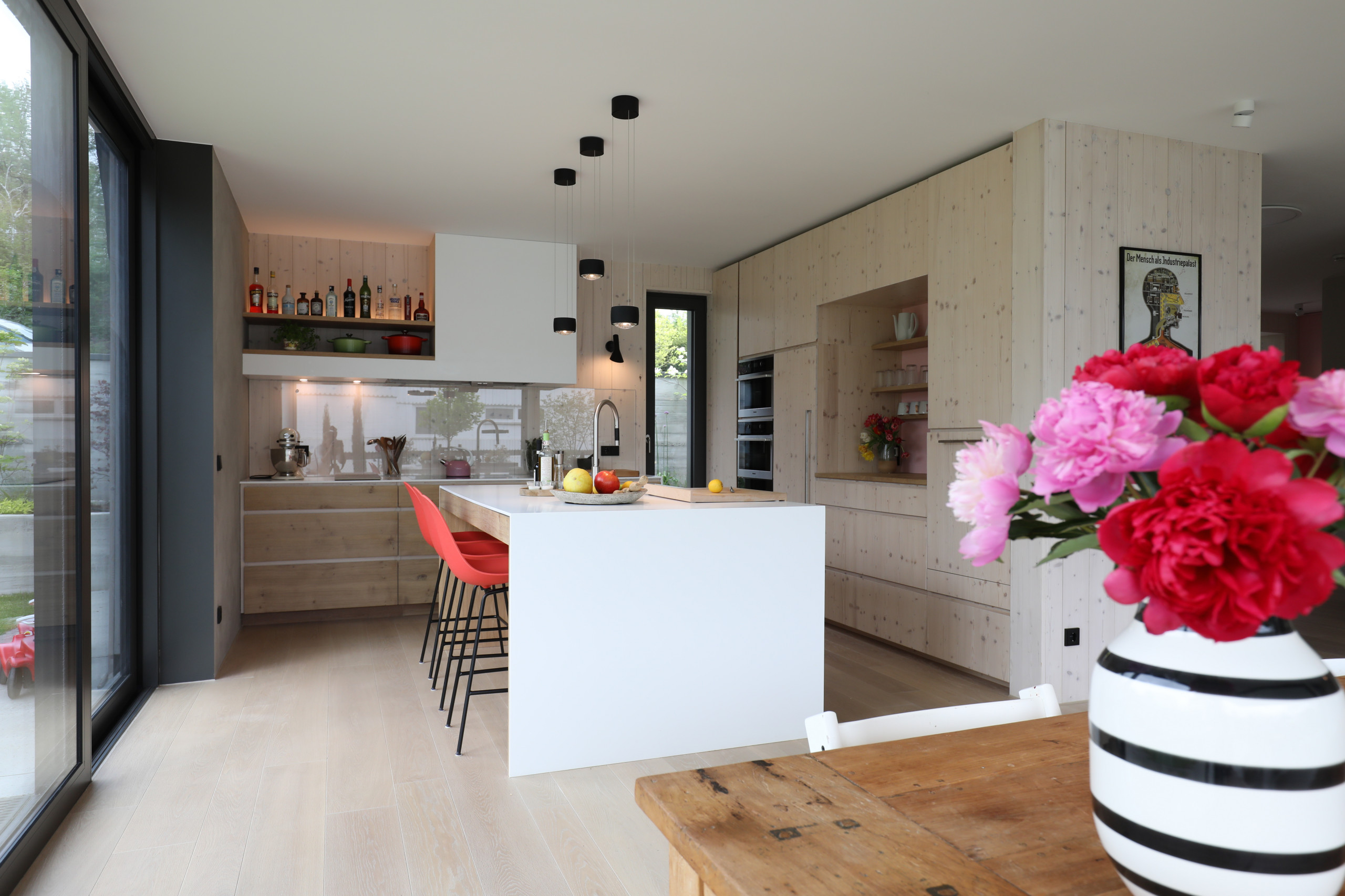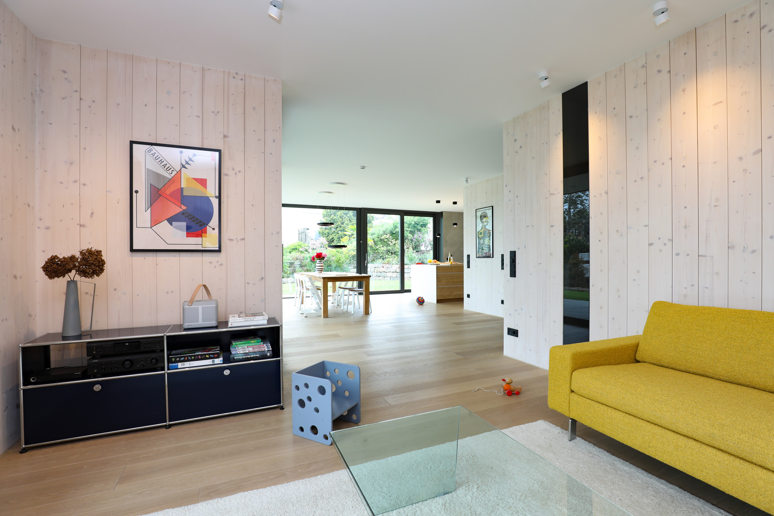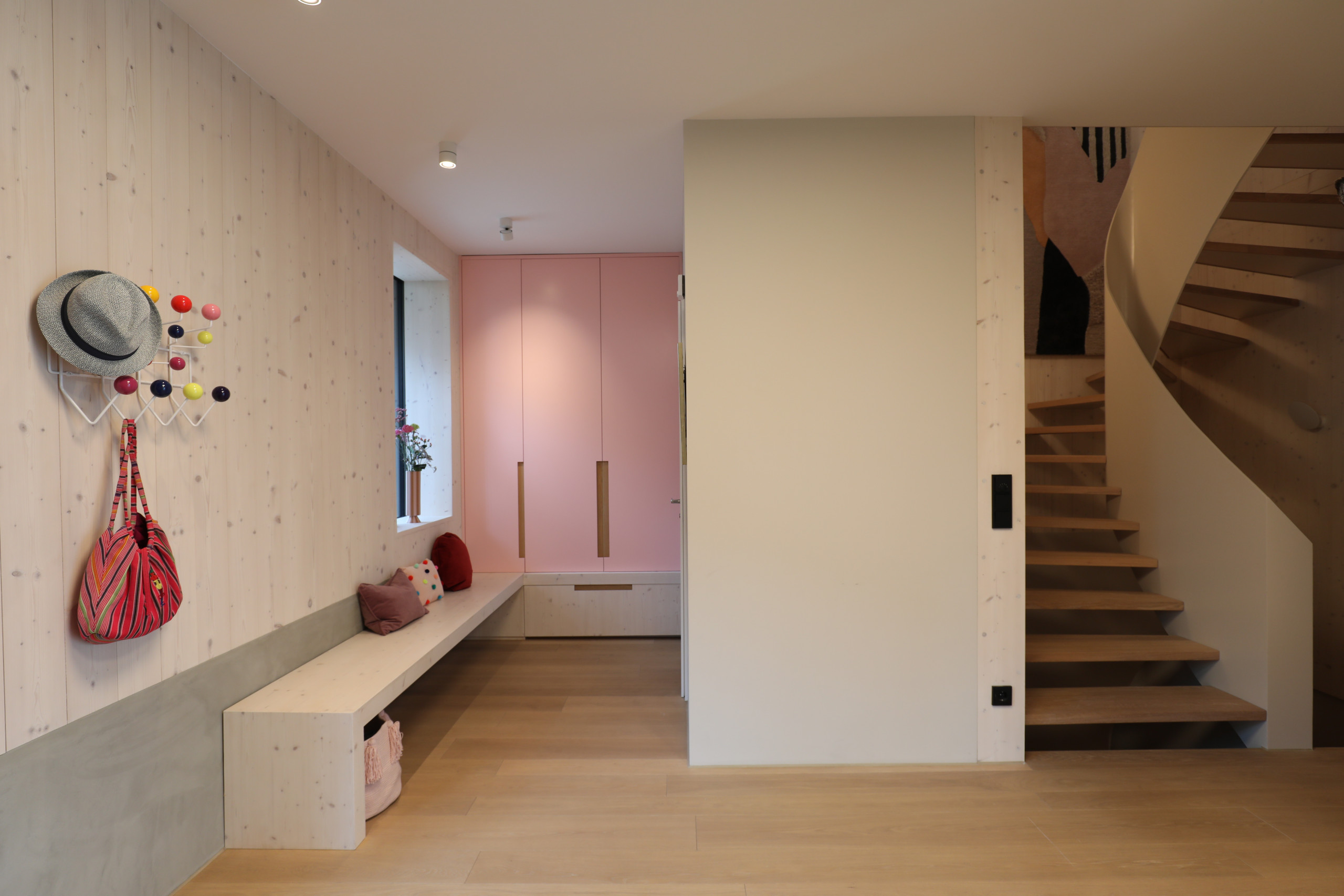 Farbakzente im hellen Innenraum. Innen ist das helle Fichtenholz an den Wänden sichtbar. „In Holzhäusern stellt der Körperschall häufig ein Problem dar. Wir haben daher die Decken mit Akustikpaneelen abgehängt“, erläutert Neugebauer. In dieser hellen Umgebung verbreiten farbige Akzente Fröhlichkeit. Das Rosa des Flurschranks wird in einer Nische der Küche wieder aufgegriffen, im Obergeschoss sind Schranktüren grün lackiert und im Bad braun. Dazu setzen einzelne Möbel wie das Sofa, die Garderobenhaken oder die Stühle an der Kücheninsel Farbtupfer. „Das Haus ist statisch, aber drinnen darf es lebendig sein“, beschreibt der Architekt sein Faible für Farben.