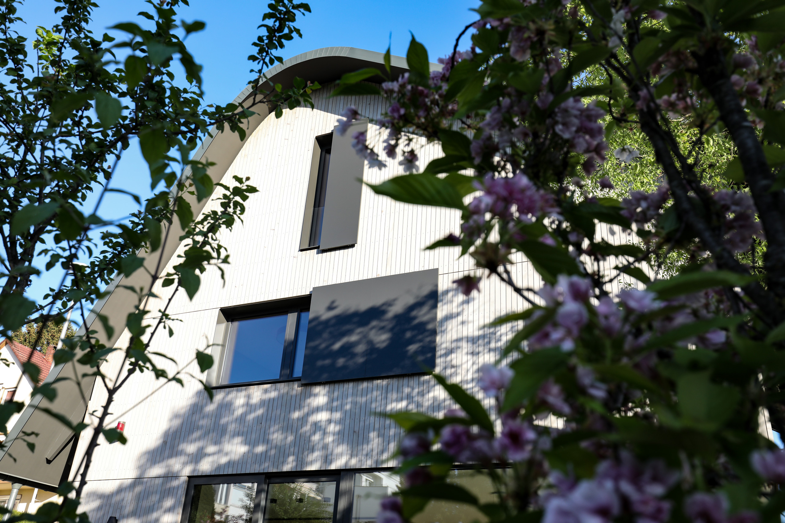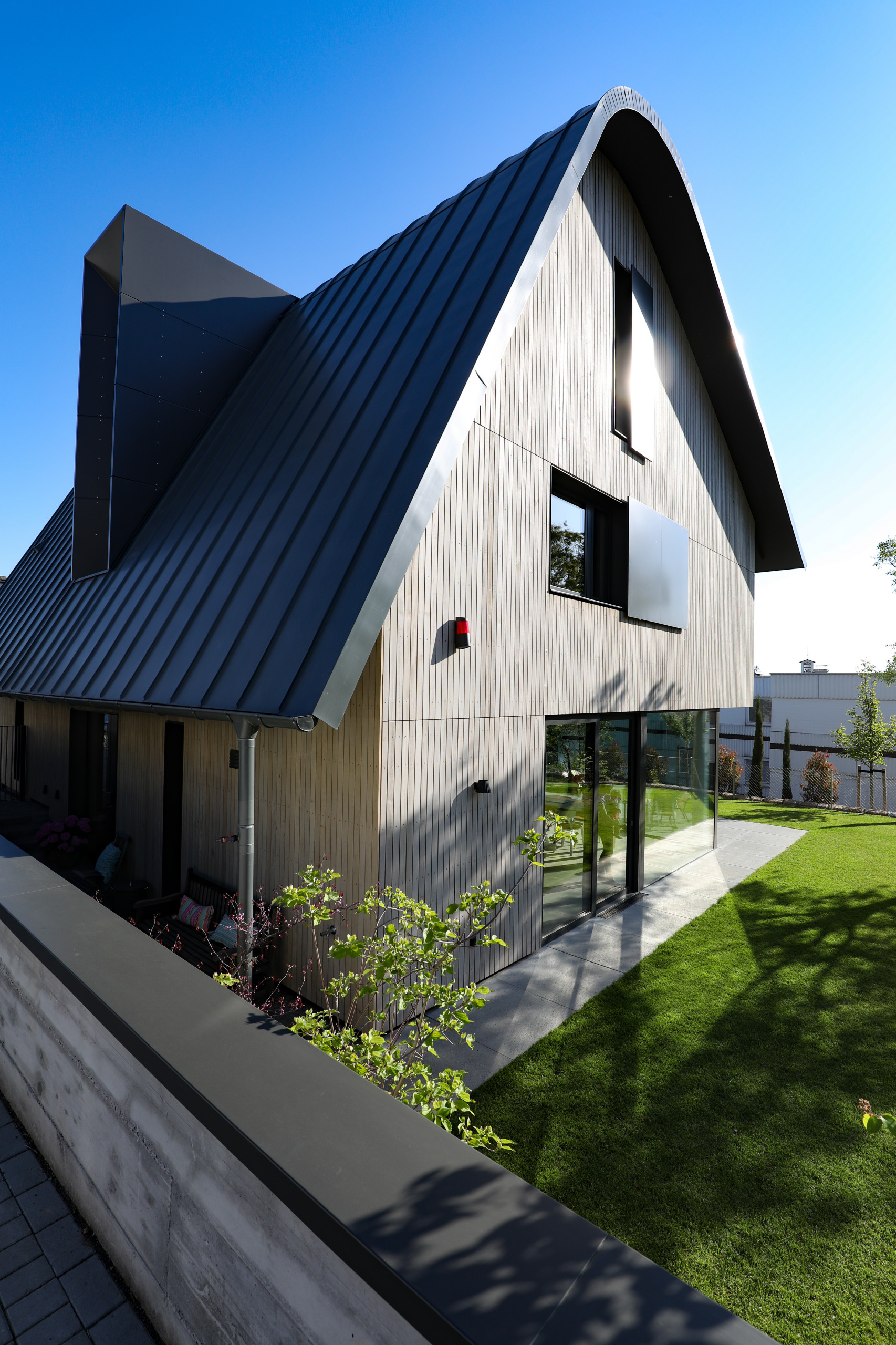 Genaue Planung im Vorfeld. Über die Rundung des Firsts wölbt sich das Stehfalzblech der Dacheindeckung. Dachrinnen und Fallrohre verlaufen verdeckt entlang der Traufen und hinter der hinterlüfteten Fassade aus vorvergrauten Lärchenlatten. „Im Holzbau muss genau geplant werden. Der Platz für die Technik, für jede Steckdose und jeden Schalter muss vorab definiert werden. Nachträgliches Schlitzeklopfen ist nicht möglich“, so der Architekt.