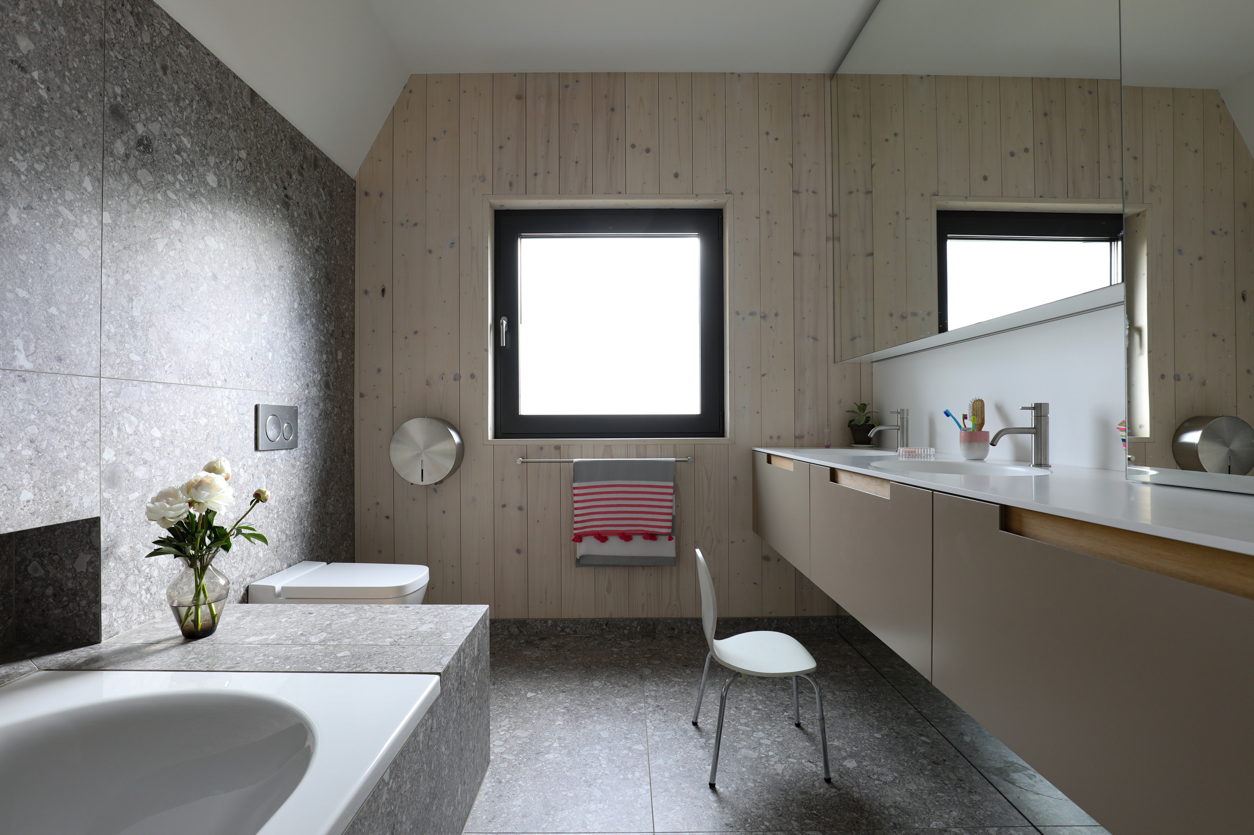 Im Bad sind Feinsteinzeugfliesen von Mirage verlegt. „Jahrelang war ich auf der Suche nach diesen Fliesen, die ich aus meinem Lieblingsskihotel kenne. Als ich mit der Bauherrin unterwegs war, habe ich sie entdeckt. Die mussten dann unbedingt in dieses Haus“, erzählt Neugebauer. Der Waschtisch ist ebenso wie die Kücheninsel aus Corian.