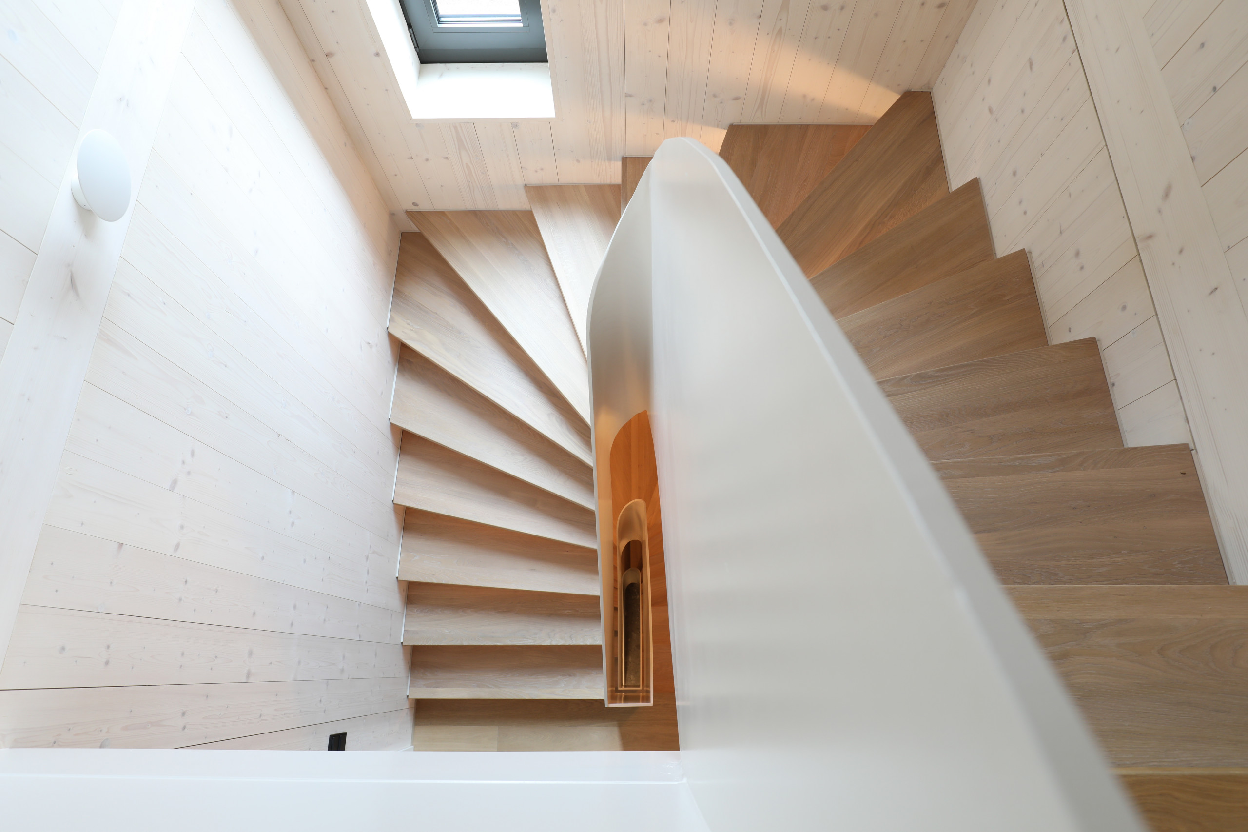 Langlebige Materialien. „Die verwendeten Materialien sollen rückbaubar und recyclebar sein“, erklärt der Architekt. Innen sind die Wandoberflächen nur feingeschliffen und lasiert. So konnte das Holz sichtbar belassen werden. Selbst der Spritzschutz in der Küche ist aus Glas, um das Holz nicht zu verdecken.