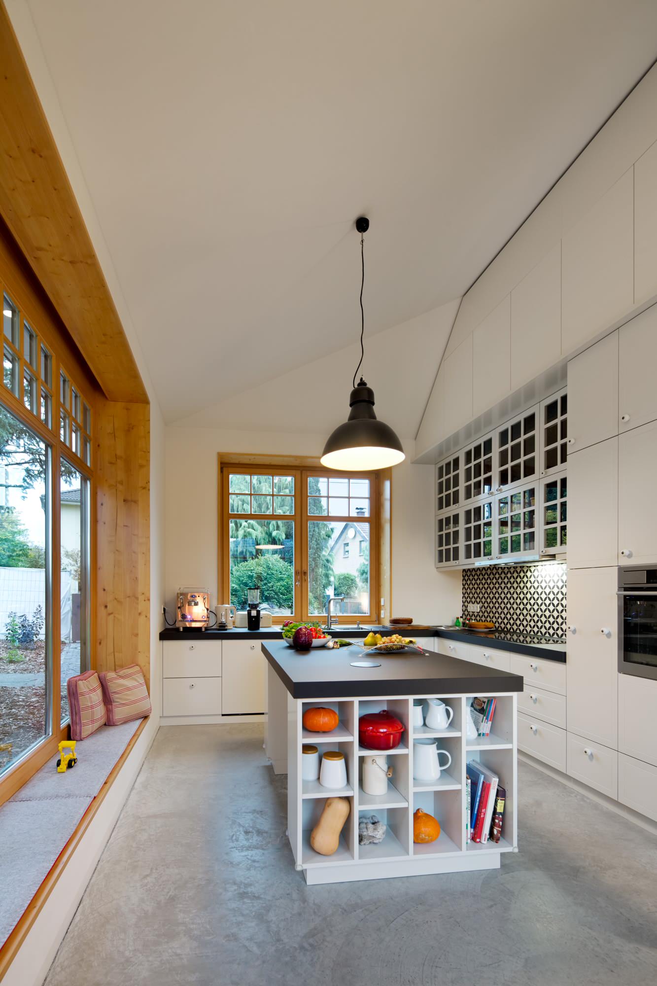 Nicht aus einem Guss wie im vorherigen Beispiel, sondern bewusst mit Materialkontrasten spielend, öffnet diese Kücheninsel ihren Walfischbauch, um Bewohnern wie Gästen allerlei sorgsam Kuratiertes zu präsentieren. Zu verdanken haben die Besitzer das dem Einfallsreichtum von Julie Witzel. Sie entwarf das Ensemble mit einer Arbeitsplatte aus Beton und einem Innenleben aus Verbundholz.