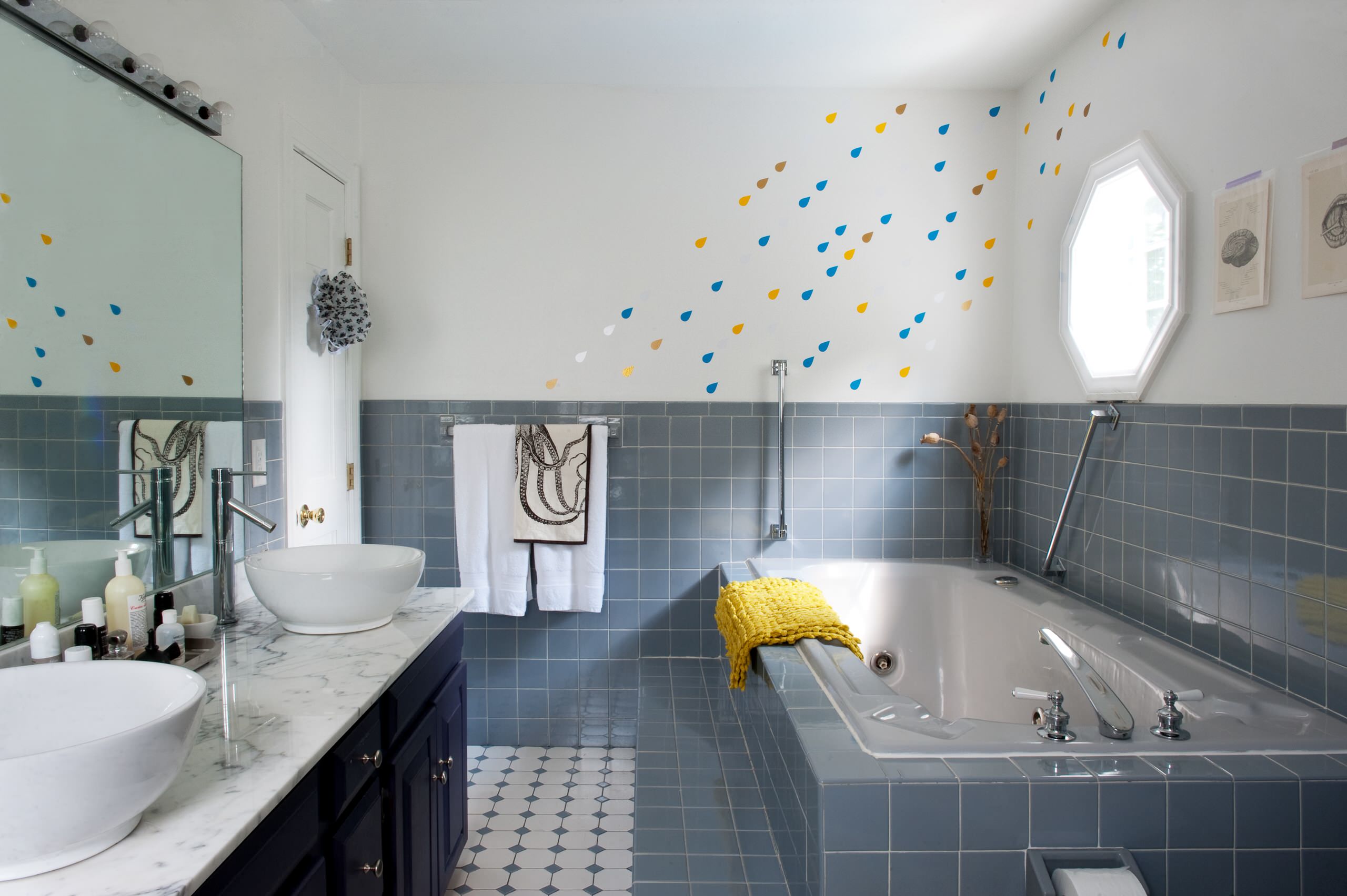 Auch vor Feuchträumen machen Wandtattoos nicht Halt. Ins kühle Nass springt man in diesem Bad samt bunten Wassertropfen von Dana Decal an der Wand.