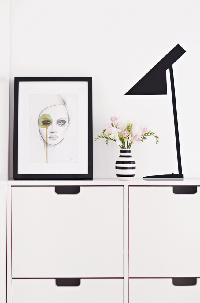 Auf diesem weißen Schuhschrank haben ein gerahmter Print und frische Blumen ihren Platz gefunden. Und die Leuchte? Die ist nicht echt, denn ein Wandtattoo „ersetzt“ sie. Angelehnt an die Form der ikonischen „AJ“-Lampe (Louis Poulsen) ist der Aufkleber ein witziger Hingucker.