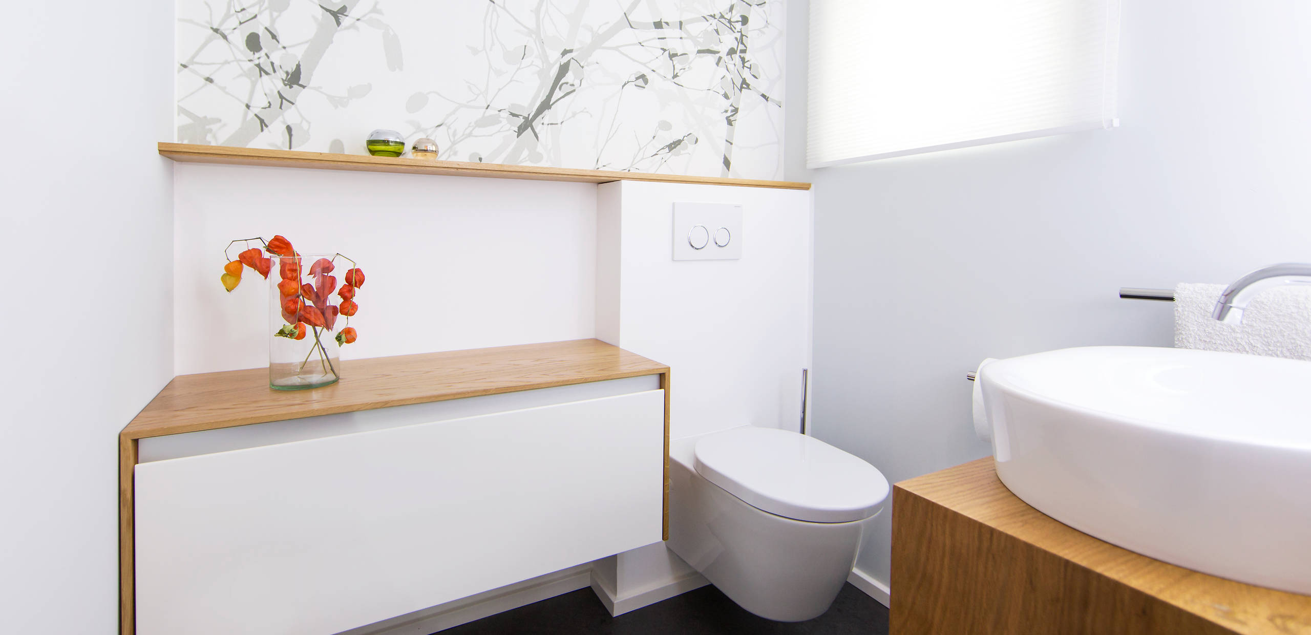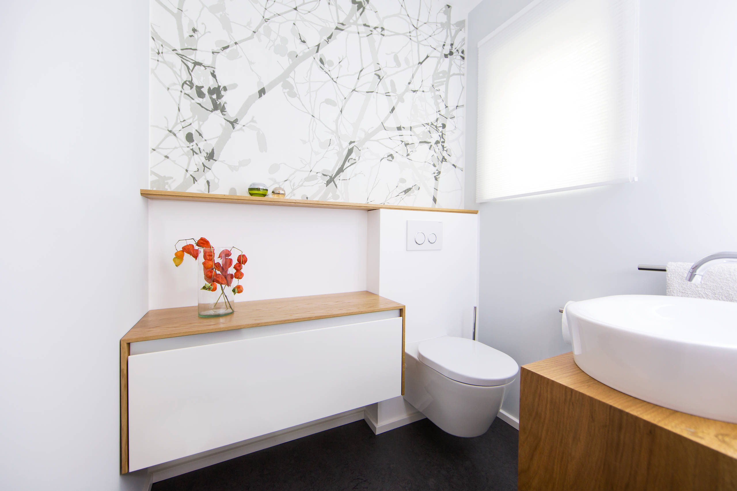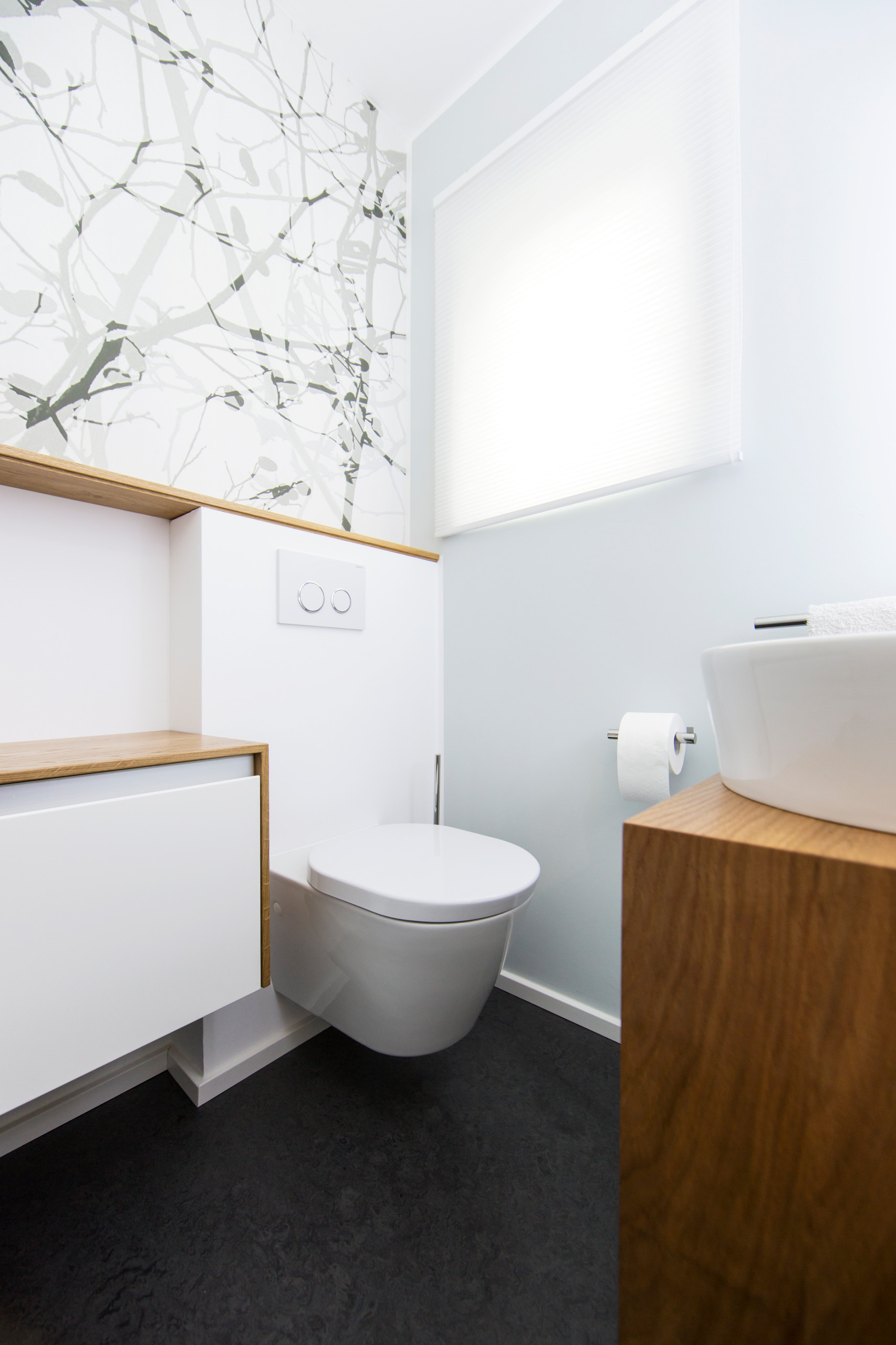 Nicht immer muss bei einem Umbau also alles Störende entfernt werden. Häufig reicht es auch, geschickt zu kaschieren. Das hat Schubert auch bei dem alten Kunststofffenster gemacht. Sein steriler Charme hätte nicht zum neuen Ambiente der Gästetoilette gepasst. Es ist hinter einem Wabenplissee von MHZ verschwunden. Durch diesen Sichtschutz fällt diffuses Tageslicht in den Raum.