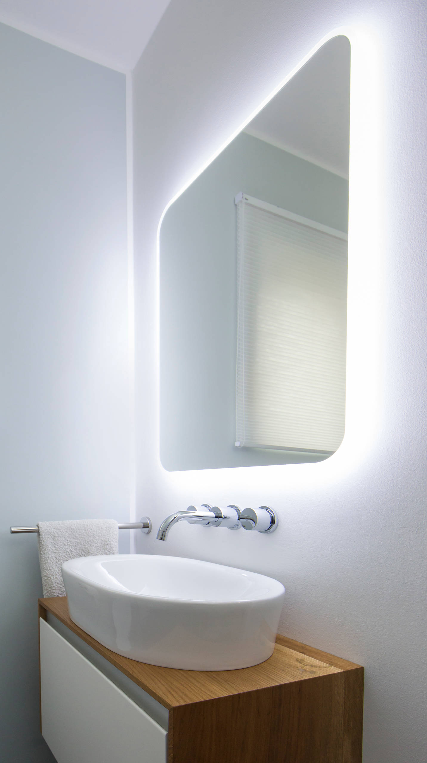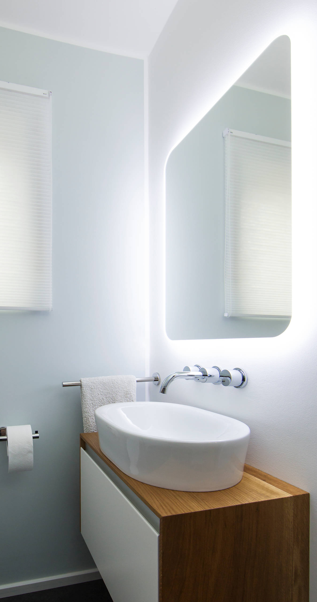 Einzige künstliche Lichtquelle ist die Beleuchtung hinter dem Spiegel. „Die Bauherrin hat durchaus auf die Kosten geachtet. Doch bei diesem Spiegel von Keramag konnte sie einfach nicht widerstehen“, verrät Schubert.